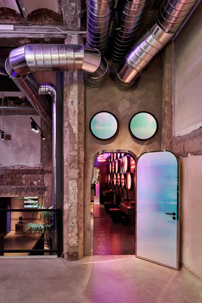 在上面的空间,你可以找到Lynk & Co选择的可持续物品的展示区,以及意想不到的联合办公区,如游泳池,它位于以前空间的一个旧保险箱门后面。