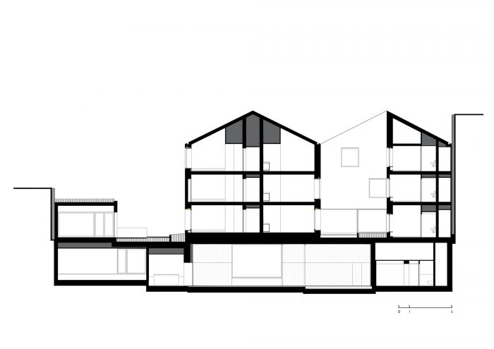 the reuse of the structural configuration of the existing buildings reproducing, the new construction, and the three volumes of the former buildings.