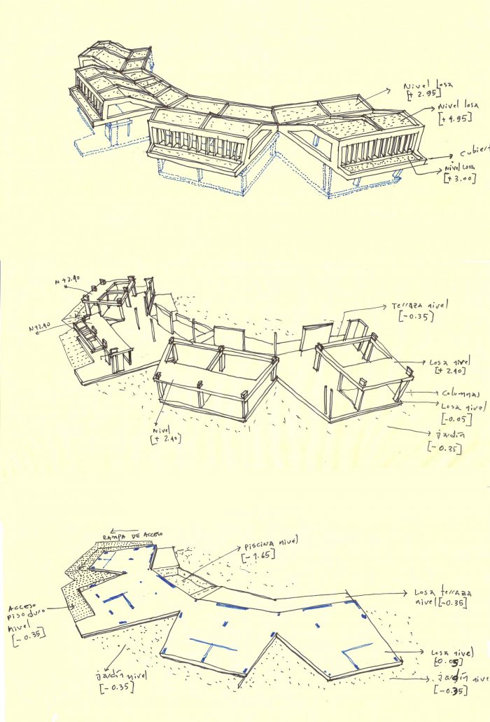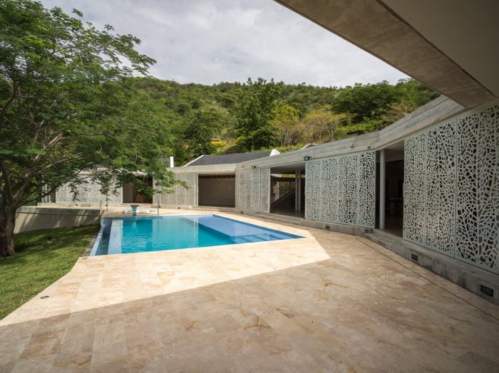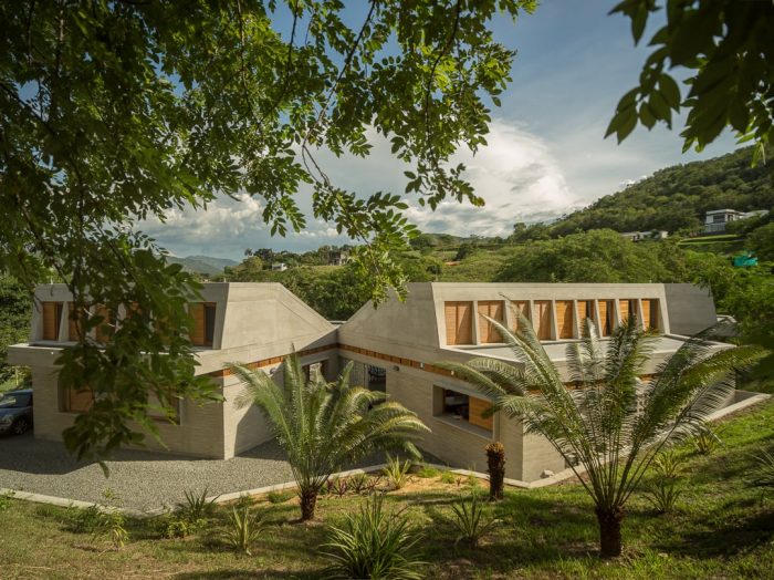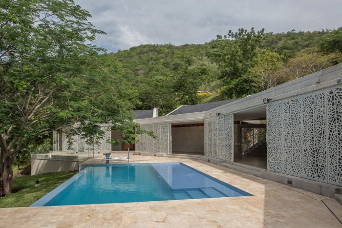 In plan the house is defined by four modules coiled around a tree and the distant landscape of the Cauca River. The first module contains the master bedroom, the second and fourth modules contain two guest bedrooms each, and the third has the social and services areas. These modules connected by a corridor define a concave exterior space where the pool and recreation areas are located. Fragmentation in modules and angle changes allow the house to increases its facade area exposed to natural air currents and thereby increase its permeability.