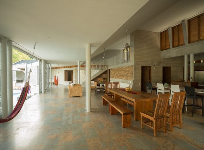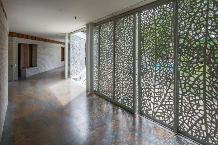 在这种情况下,正如该地区的传统建筑一样,走廊作为一个开放的、细长的阴影区,可以悬挂吊床,观看远处的风景;为了控制阳光,并在某些情况下关闭这个区域,大型金属滑动门被设计成60%的穿孔模式,即使在空间不开放的时候也可以自然通风。房子的位置使走廊几乎一年四季都能保持阴凉。