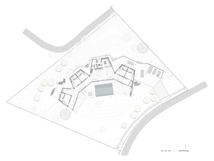 这座房子适应了早先修改过的地形条件:一个倾斜的山坡被切割成一个平坦的区域和一个大的后坡。鉴于这种情况,房子利用了平坦的区域,但试图恢复山的轮廓,将两层高的区域放在后面,而低的区域则放在前面的阴影下。在截面上,我们定义了一条通往景观的低矮走廊,以及朝向斜坡的两层房间,通过一个倾斜的钢筋混凝土屋顶连接,引导风流从低处到高处的通道。