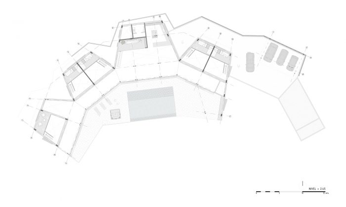 在平面上,房子由四个模块组成,围绕着一棵树和考卡河的远处风景。第一个模块包含主卧室,第二和第四个模块各包含两间客房,第三个模块是社会和服务区。这些模块由一条走廊连接,定义了一个凹形的外部空间,游泳池和娱乐区就在这里。模块的分割和角度的变化使房屋增加了暴露在自然气流中的立面面积,从而增加了它的通透性。