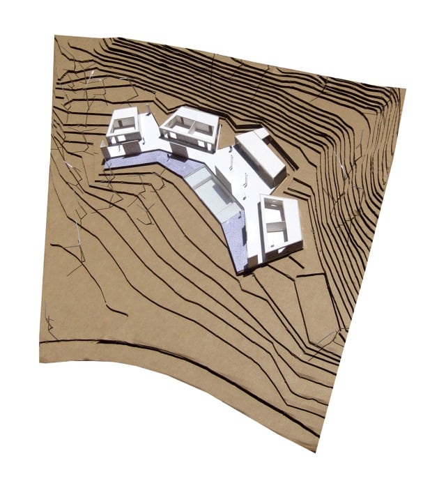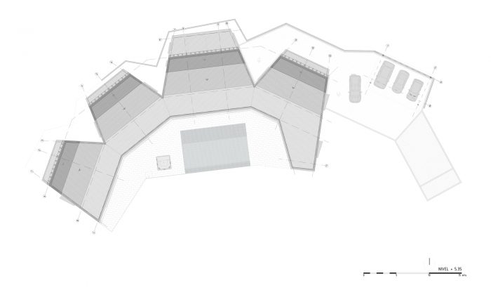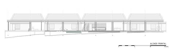 This house adapts to the topographical conditions of a lot that was modified earlier: a sloping hillside was cut to produce a flat area and a large rear slope. Given this condition the house makes use of the flat area, but try to restore the profile of the mountain locating the high areas with two levels to the back, and the low areas shaded to the front. In section, we define a low corridor to the landscape and rooms with two levels towards the slope, connected through an inclined reinforced concrete roof that leads the passage of the wind currents from the low to the high areas.