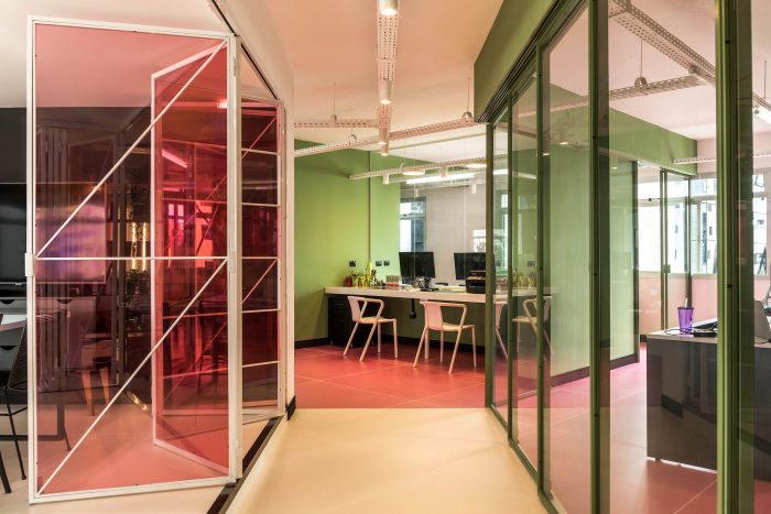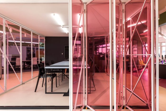 寻找不寻常的材料是 "疯狂创意 "的业主的要求。据建筑师说,"他们提出了一个具有城市风格的环境建议,与品牌美学相匹配,并带来创新和创意,用不明显的材料给人以惊喜"。彩色金属结构、蓝色地毯、油漆天花板、胶合板和中密度纤维板:颜色和纹理的混合占据了整个空间,在物业的入口处就能看到一个用粉色胶合板制成的门户,旨在展示和储存该机构开发的项目。这个空间不仅仅是一个工作场所,它是一个品牌声明,激励并欢迎其客户和员工。