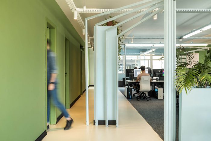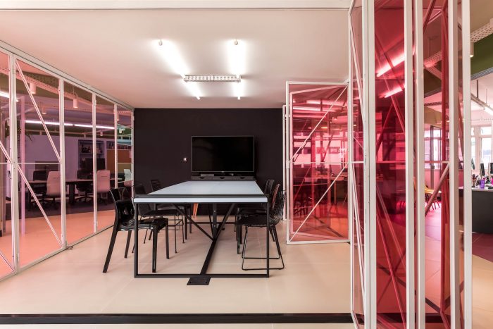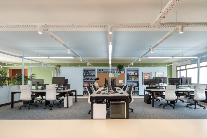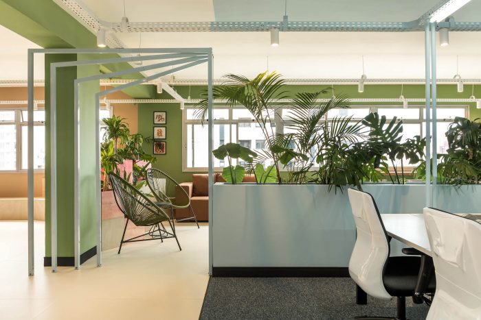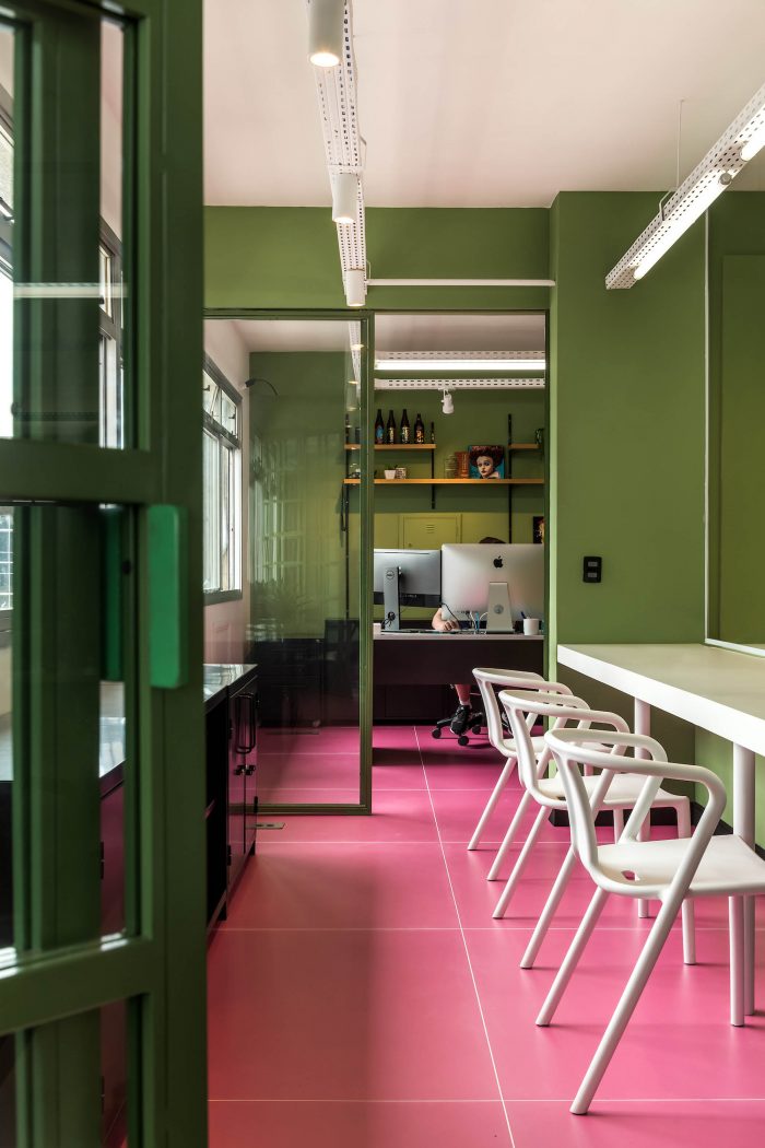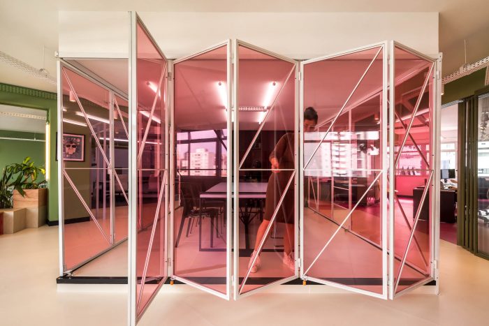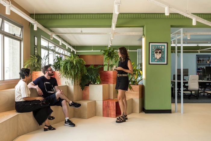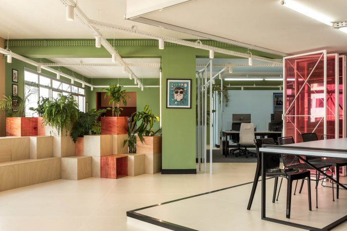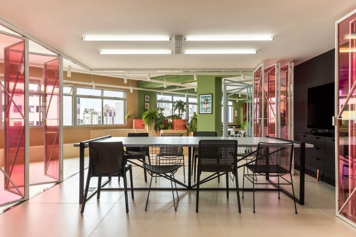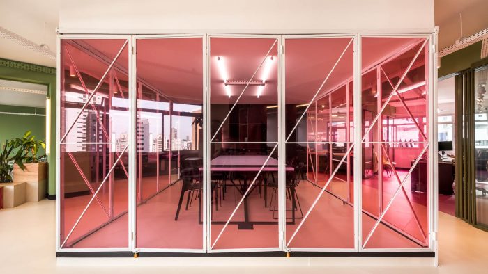 The main goal of the project was to create an environment that would function as an extension of the home office, to facilitate the return and instigate the creativity and productivity of the employees. For this purpose, color-divided areas were developed, with space for group activities, work dynamics, discussions, collective meals, and resting time. The comfort and fluidity of the environment were the main starting points for the project. In the meeting room, a system of folding doors was developed to integrate the entire area. Right in front of it, there is also a grandstand that offers sitting for big presentations and makes the environment more inclusive and relaxed.