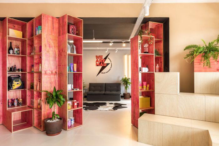 The search for unusual materials was a requirement of Mad Creative’s owners. According to the architect, “they came up with a proposal for an environment that had an urban style that matched the brand aesthetics and brought innovation and creativity, surprising with materials that were not obvious”. Colored metallic structures, blue carpet, painted ceilings, plywood, and MDF: the mix of colors and textures takes over the space and is seen right at the entrance of the property, in a portal made with pink plywood, designed to display and store the projects developed by the agency. More than a workplace, the space is a brand statement that inspires and welcomes its customers and employees.
