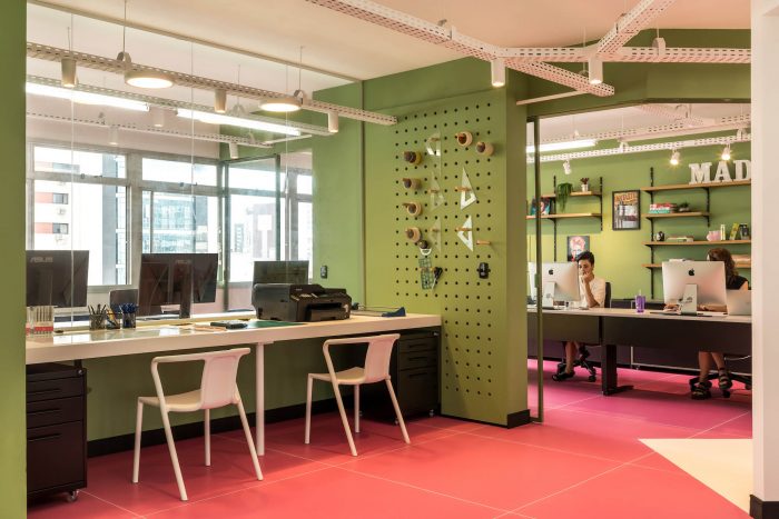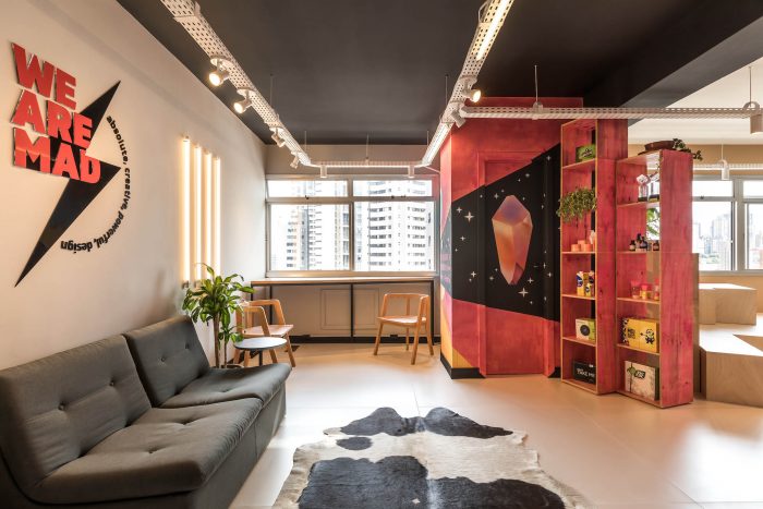 A mix of colors, textures and unusual materials define more than 200 sq m, in Moca Architecture's project for Mad Creative, a product design agency, located in downtown Curitiba, south of Brazil. Responsible for the development of major brands nationwide, the agency turned to the architecture office, led by partners Ana Sikorski and Katia Azevedo, to create a space three times larger than the one previously occupied. The project was motivated by the expansion of the team and, mainly, by the return to the traditional office routine. “They were in a smaller studio and called us to develop a space that would provide more life quality for employees and comfort for those who work there”, explains Ana.