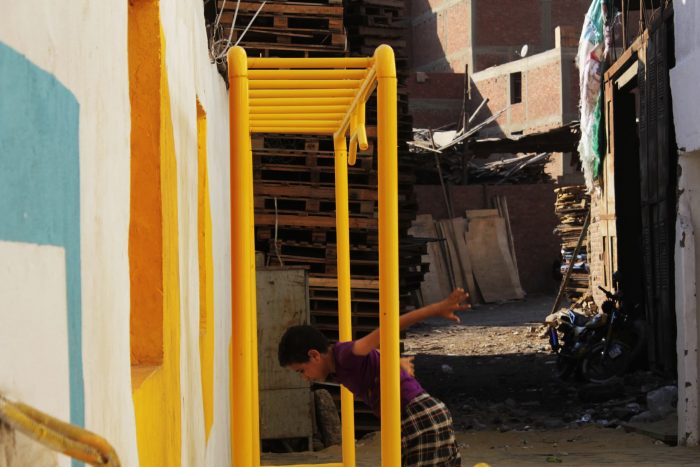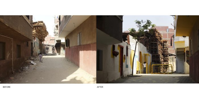 The project included a refurbishment of building elevations, infrastructure, street benches, pavers, landscaping, lighting, and a detachable multipurpose use kid’s area. The series of workshops were based on the imposition of the question “what is the street to you?” In a place like Ezbet Khairallah, the street is everything. At times, it’s the living courtyard for sitting and sharing, and at other times it’s a place for festivities on which the whole area is shifted into one big hall.