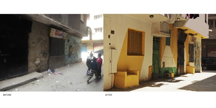 The design strategy focused on creating a palette on which very simple colors could be laid to tone down the set of un-patterned environments. Moreover, adding to an existing layer of murals and interventions to cut back on a limited budget as well as maintain a relatable identity. Subtle additions abstracted from traditional upper Egypt houses lined the windows, playful patterns of pavers incite the high population of children to interact, and simple wooden brick-laid benches affirm the “Mastaba” principle in old Egyptian houses. The street then becomes a living vibrant environment free from bad behavior such as drug use and harassment caused earlier by the deterioration of street elements.