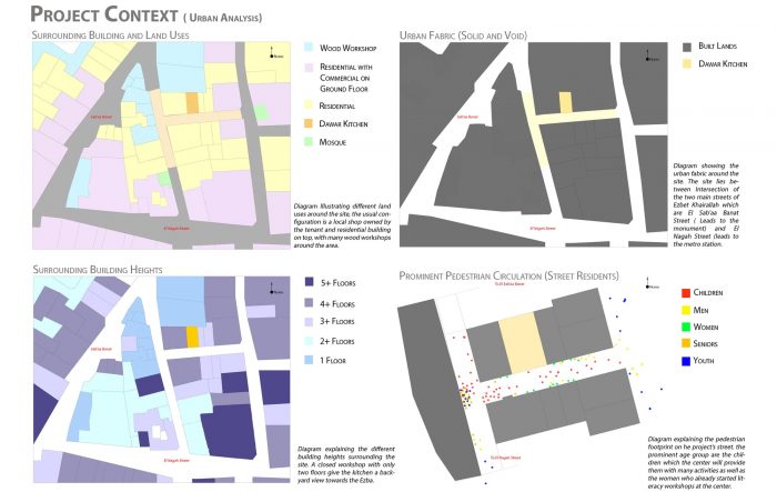 In the course of two years through this project, the identification of such a notion was constantly changing due to terms concerned with ownership, preference, and compromise. Moving on with the project, it came as a realization that basic necessities such as paving, infrastructure, and lighting were much more important than an introduction to new architectural languages. However, while working with the process, new ideas and paradigms were introduced to change the urban dialogue which is one of the core concepts of the Dawar el Ezba Cultural Center.