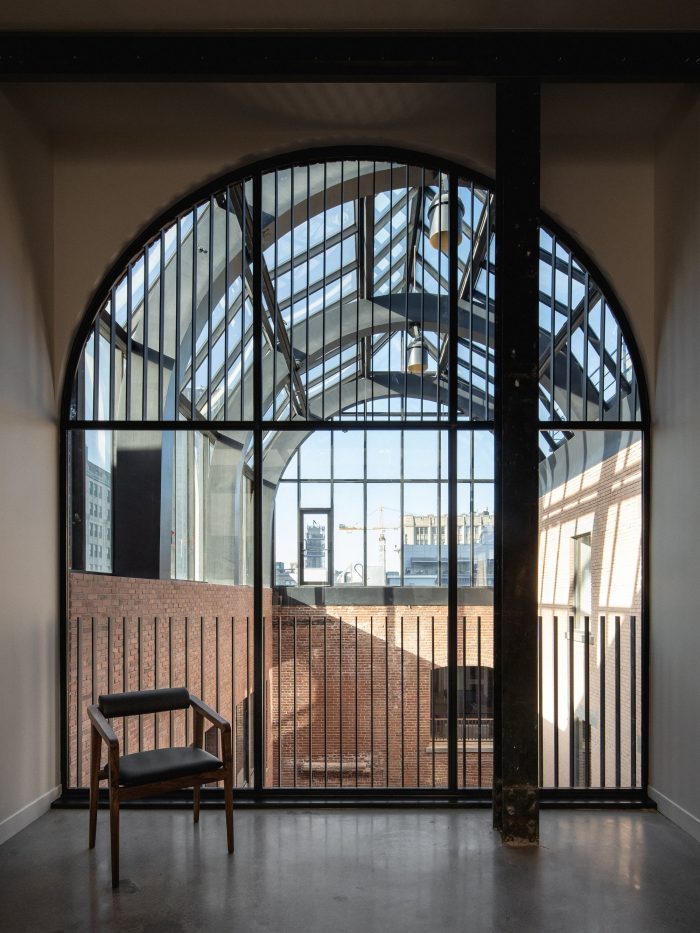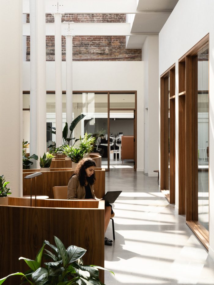 Leaving a downtown tower to settle in Old Montreal, Accuracy chose a place full of character and history that strongly inspired the architects. Whether with the careful separation of the new volumes from the original mill floor ceilings, or the natural materials, such as walnut and lime plaster, the design highlights the architectural heritage of this former warehouse, built in 1868, with its solid masonry walls and its wood and steel structure. Covered by two monumental skylights that create inner courtyards, the generously planted space bathes in natural light, injecting a unique character and an exceptional spatial quality into it, which is magnified by the interior architecture.