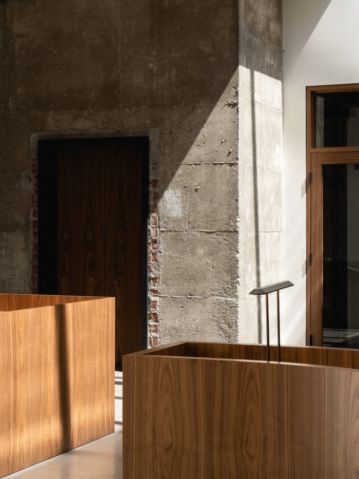 In the client wing, walnut warmly dresses the various conference rooms and common areas, bringing character and elegance without falling into ostentation. The curves of the central, bespoke furniture contrast with the surrounding orthogonal shapes, giving a unique balance and signature to the project.