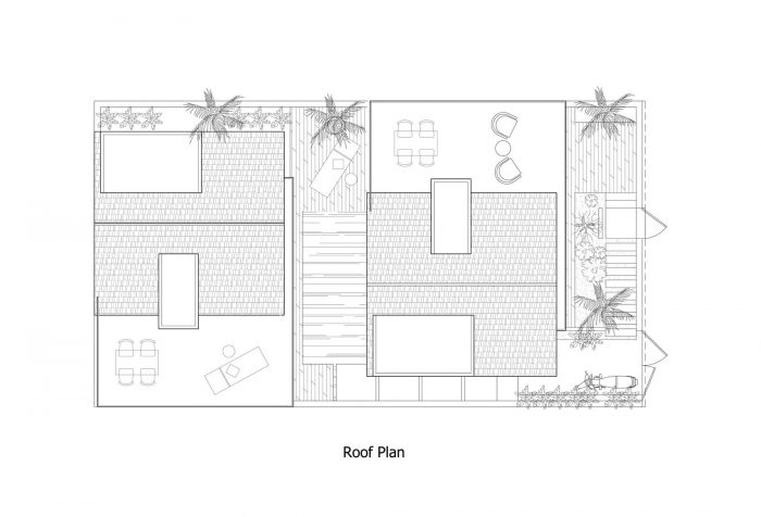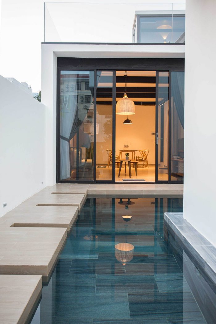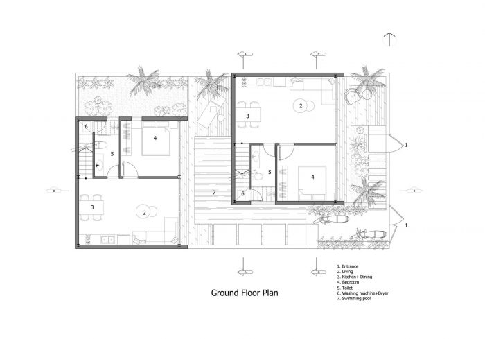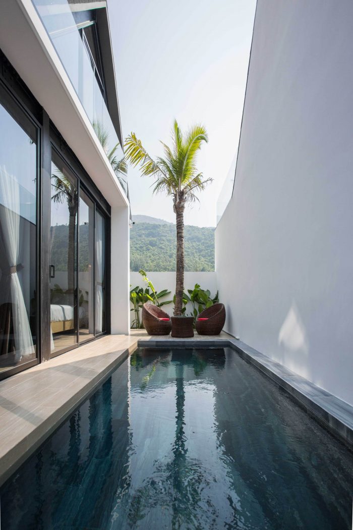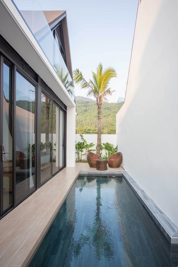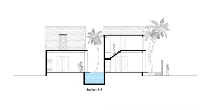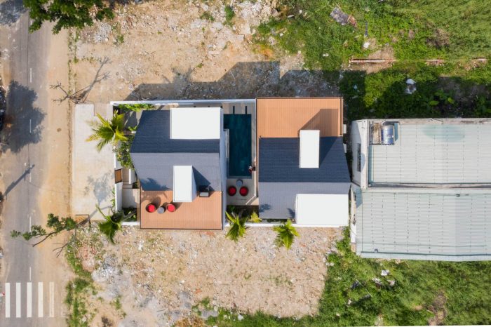 Therefore, I have proposed them to build two separate small houses. One will be ready for them whenever they visit Viet Nam and one will be rented out as around 2000 USD per month. The couple agrees right away as the proposal is reasonable and they will also have a small income without interfering with their daily routine. From there the detailed plan of the house was created. I divided the land into two parts, one in the front and one in the back. The front part is the house for rent with two bedrooms, fully equipped living room and a kitchen. The other part is the house, which they will use every time they come back to Vietnam; besides the minimal amenities as minimalist style, this house also has a small pool as a relaxing space.