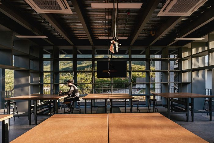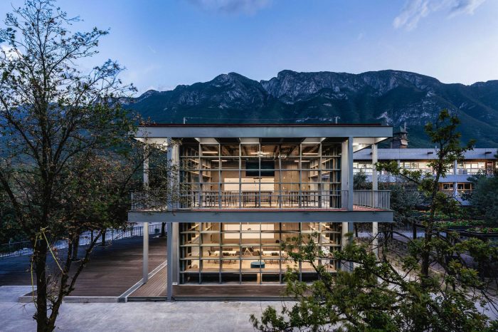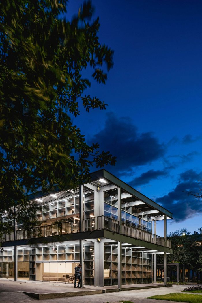 朝向外部,我们建议在周边设置有盖的通道,作为展览和风景之间的一个中间空间。这块地位于高中校园的一个界限内,被大自然所包围,可以看到城市和山脉的景色。一个在户外工作的地方,成为创客空间和校园外风景之间的最终连接。