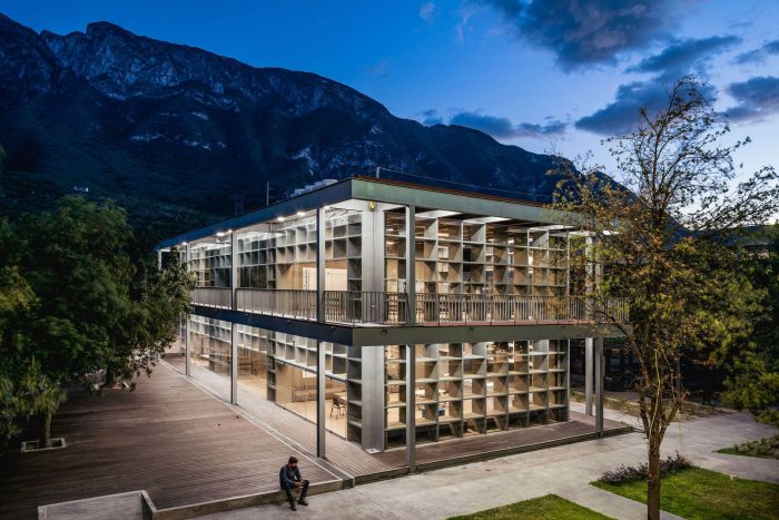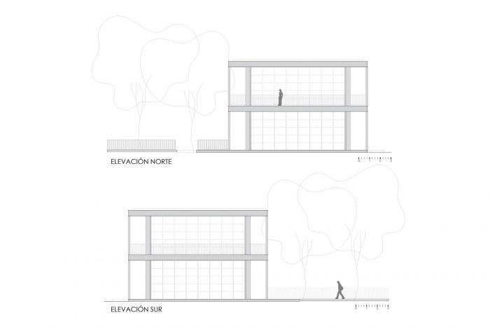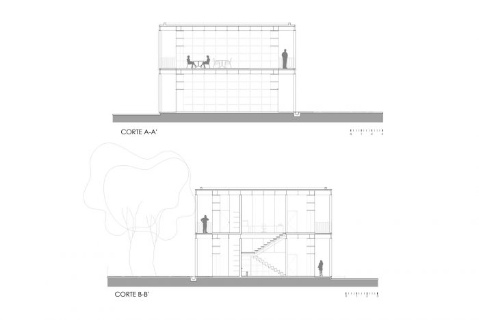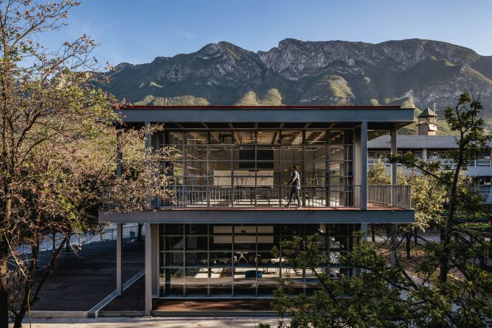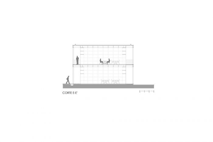 Towards the exterior, we’re proposing covered circulation in the perimeter as an intermediate space between the exhibition and the scenery. The land is located in one of the limits of the high school campus, surrounded by nature with views of the city and the mountains. A place to work outdoors, becoming the final connection between Makerspace and the scenery outside the campus.