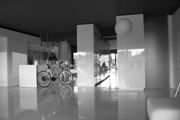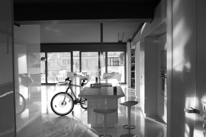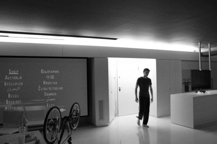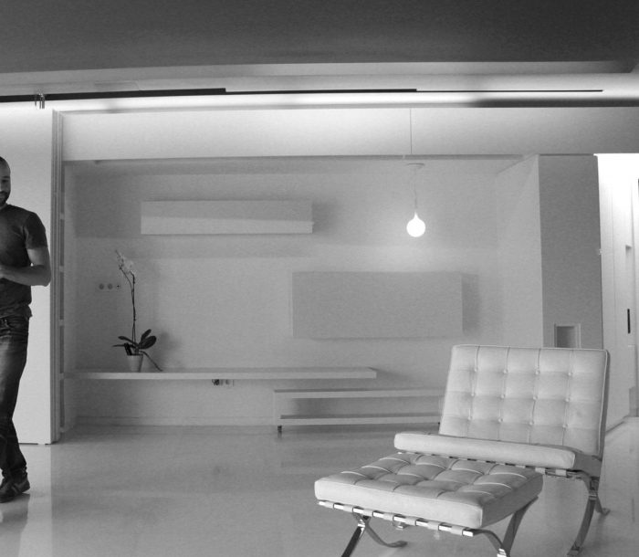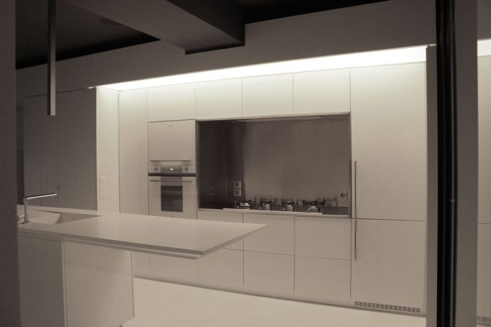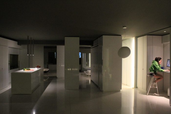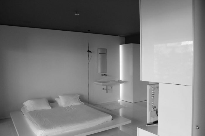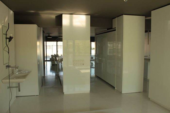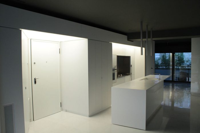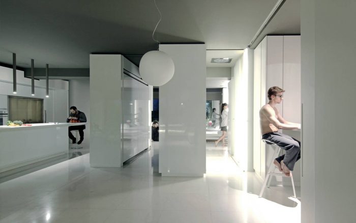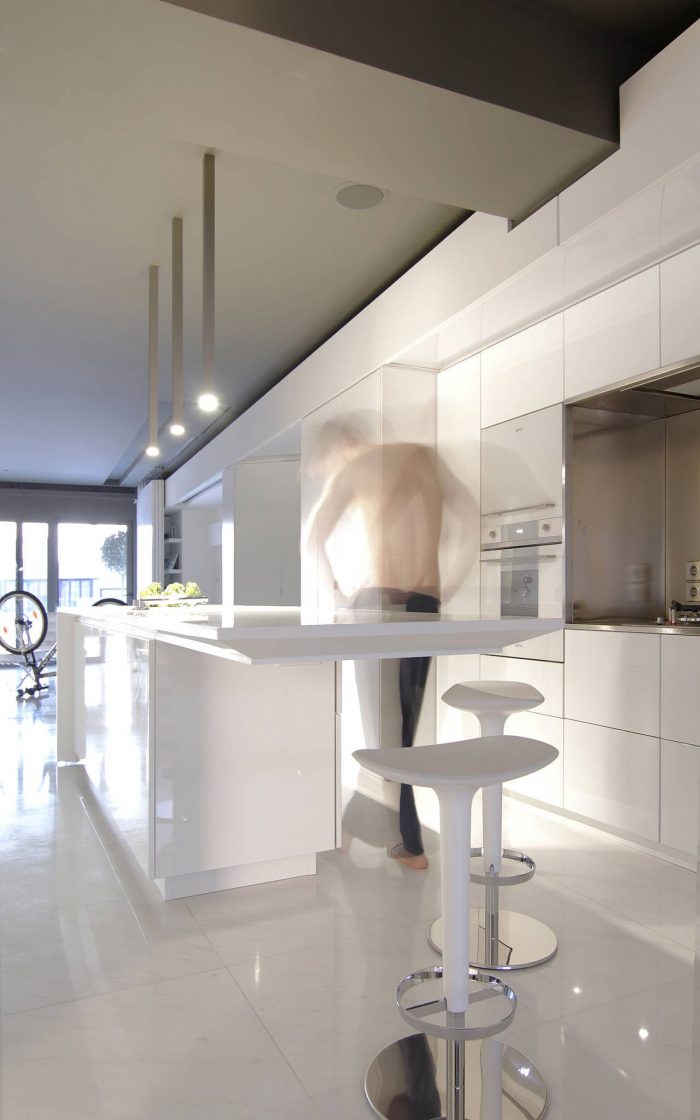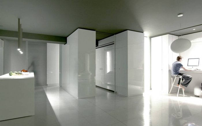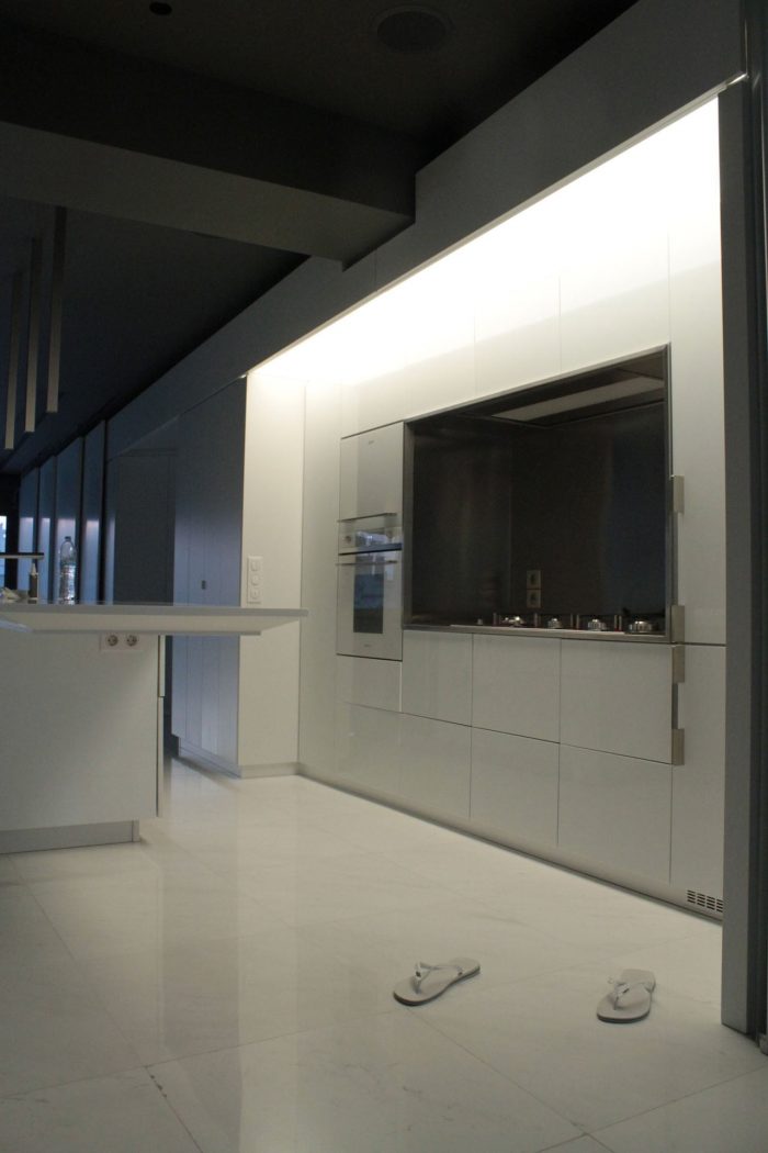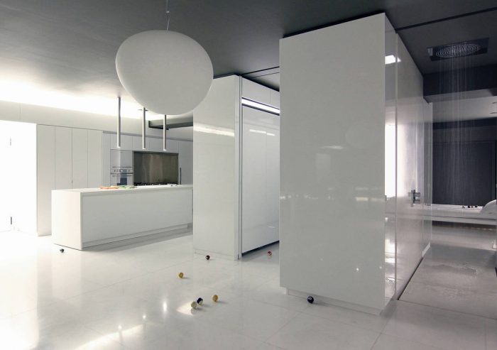 Inside the apartment, the views over the fragmented cityscape stand in contrast to the calm white interior landscape. Free-standing furniture “islands” in high-gloss white lacquer form passageways and spaces, but without boundaries. These clean rectangular blocks float on a white floor laid with large blocks of Ariston marble. Lacquer and glass sliding doors hidden in the islands and in the side-walls close off the main bedroom, shower, wardrobe, and guest room. The sliding of these doors redefines the space, revealing or concealing various functions from view.