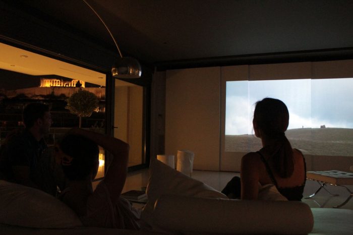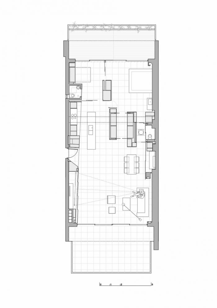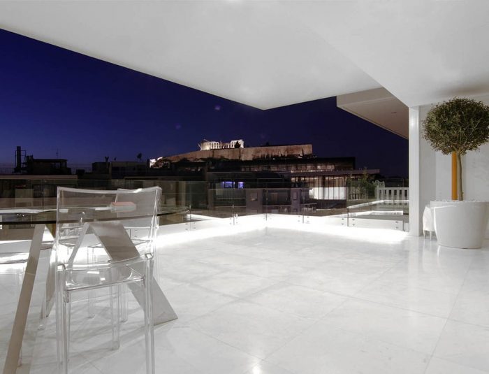 The owner’s desire for a calm and visually clear interior landscape formed the starting point of this project. The first visit to the site took place while the building was still under construction. The space in question was long and rectangular, with two enclosed long sides and two sides completely open. This openness meant sweeping urban views over Athens penetrated deep into the space; it informed the entire design process. On one side stand Filopappou Hill, an assortment of typical Athenian apartment blocks and, moreover, the dark mass of the new Acropolis Museum sitting directly beneath a view to the Parthenon. On the other side lie the yards and backs of buildings, Syngrou Avenue and, in the distance, Mount Hymettus.