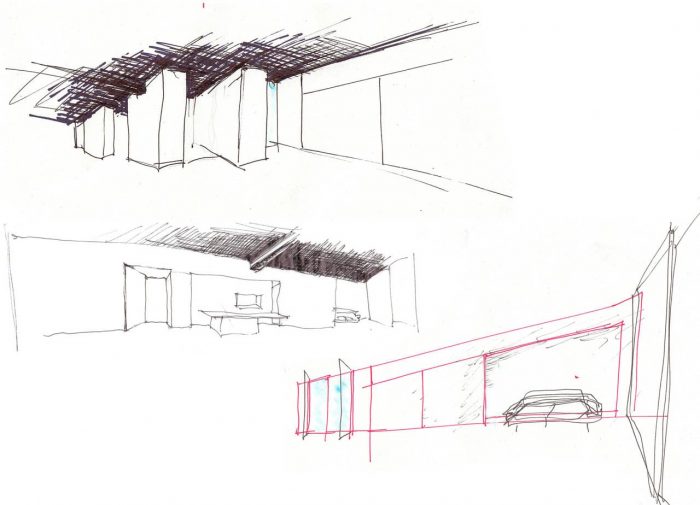 The dark grey ceiling acts as the backdrop to the “skyline” created by the dominant white forms in the space. The dark colour means the ceiling recedes from sight, and undermines the notion of a white box.