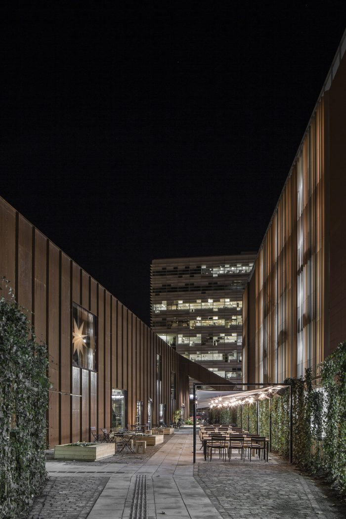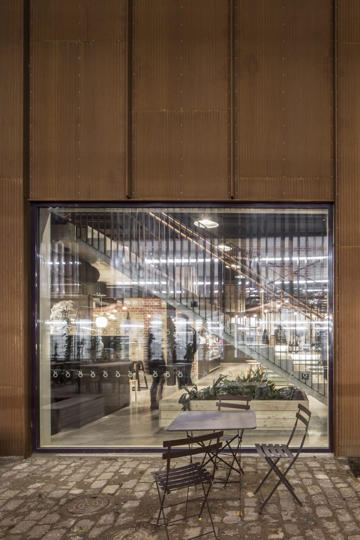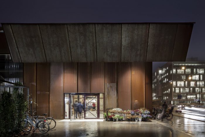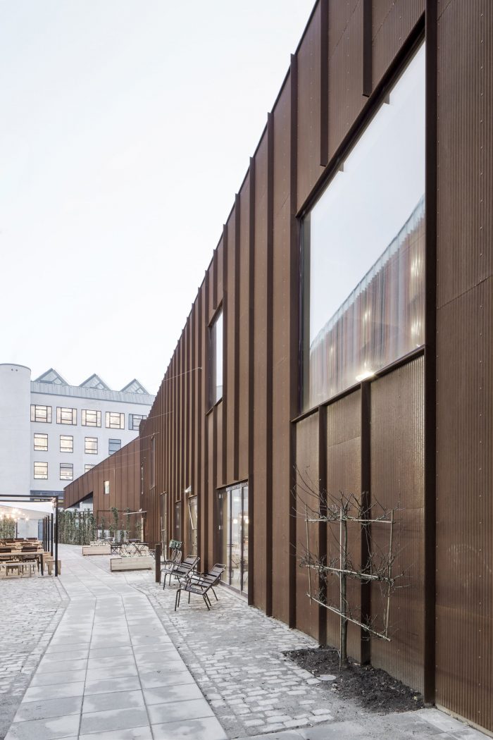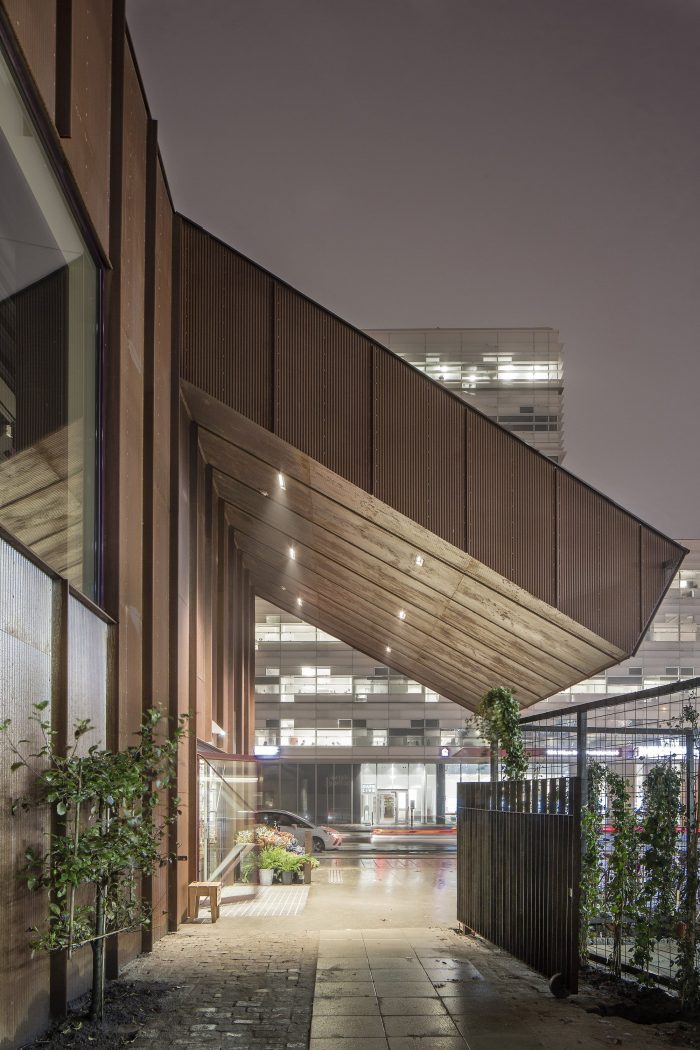 The solution was to allow the addition to imitate the gable silhouette of the existing building, but only occupy the portion of the site where the conditions were right. A gap in the roof between the existing building and the addition brings daylight to the old brick façade. The area surrounding the market hall is being redeveloped quickly, but the façade cladding of weathering corrugated steel still provides an echo of the industrial character that has dominated the district for so long. The façades’ rust red color also serves as a backdrop for the vegetation that will one day grow over the lattices that cover them. That vegetation also fills the narrow space between the market hall and the adjacent parking structure.