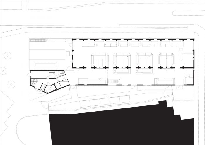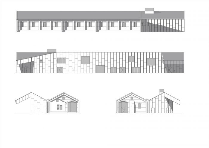 解决方案是让加建的建筑模仿现有建筑的屋檐轮廓,但只占用条件合适的那部分场地。现有建筑和加建建筑之间的屋顶缝隙为旧的砖墙立面带来了日光照射。市场大厅周围的区域正在迅速重建,但风化波纹钢的外墙包层仍然提供了对长期以来主导该区的工业特征的呼应。外墙的铁锈红色也成为植被的背景,这些植被有一天会在覆盖在外墙的格子上生长。这些植被也填补了市场大厅和相邻的停车楼之间的狭窄空间。