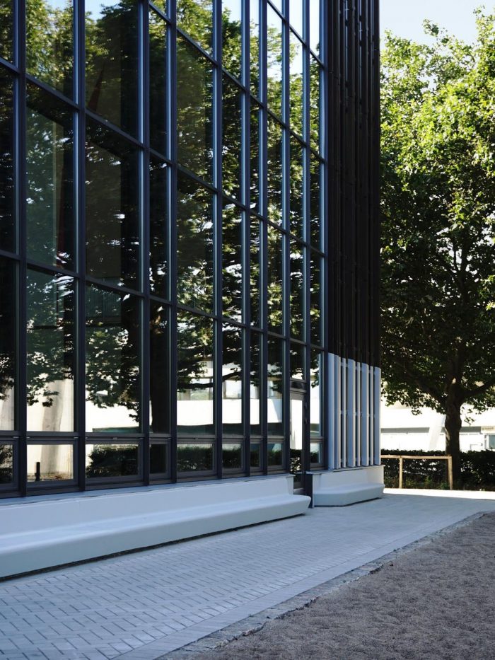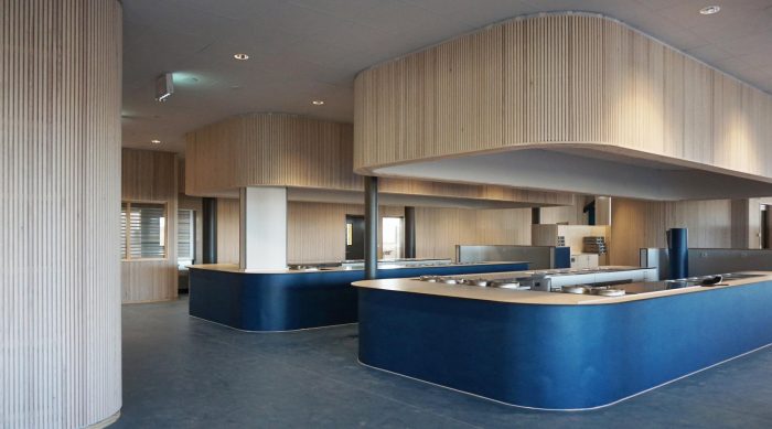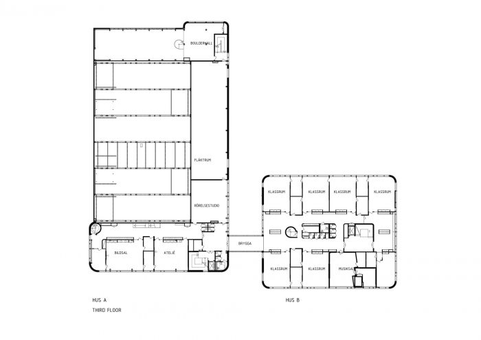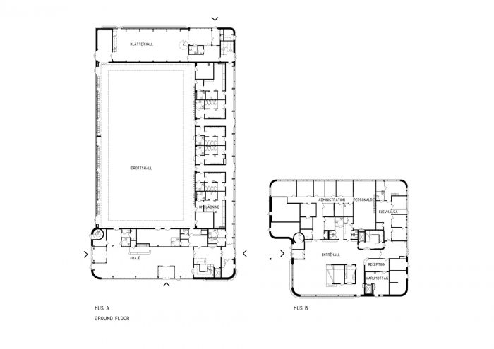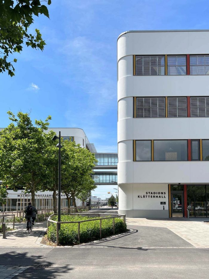Integrated with the school building is a gymnasium with seats for 500 spectators and a climbing hall with a 14 meters high climbing wall displayed behind a curtain wall. This creates a spectacular view from the outside toward the north façade.