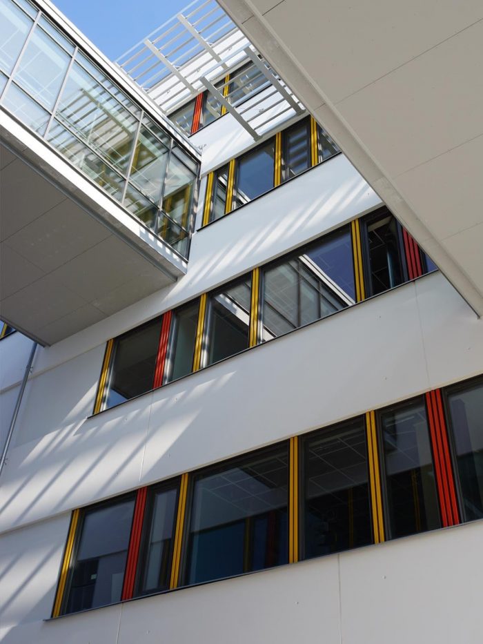 窗户和遮阳板像跑道一样一直环绕着建筑。暖色调的元素显示出这是一个儿童和青少年的活动场所。该建筑的设计也是为了提高缺乏住宅楼的地区的安全性。新的学校和体育建筑没有封闭的外墙,这使它与周围的环境相互影响。即使在较暗的时间,窗户也能照亮这个地区,显示出它的活动。