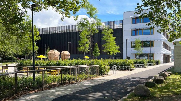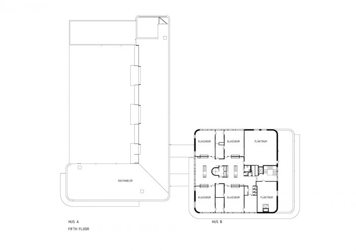 The challenges of the project were to create a school for 540 pupils on a relatively small site. This also included meeting the requirements for a pedestrian and bicycle path with access for fire trucks going straight through the plot, as well as conservation of many existing trees, restrictions due to underground installations, and requirements for a cohesive schoolyard. This resulted in a school in five stories divided into two buildings so that the pedestrian and bicycle path could run through the site. The two buildings are connected on the third and fourth levels with glass bridges. Part of the schoolyard is placed on the roof of the gymnasium on level four.