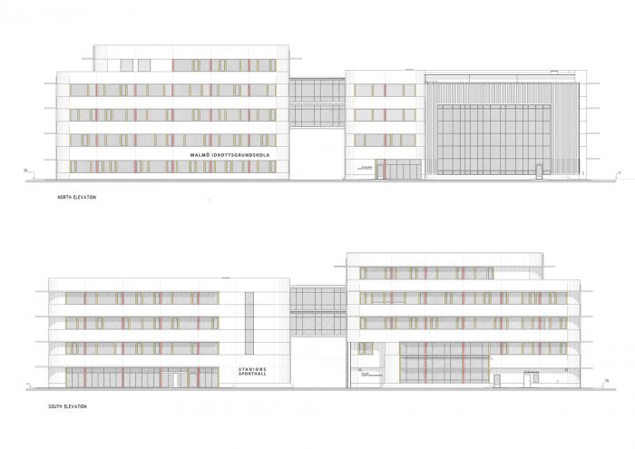 The windows and sunscreens are running all the way around the building like running tracks. Elements of warm accent colors show that it is an active place for children and teens. The building is also designed to improve the safety in areas that is lacking residential buildings. The new school and sports building have no closed facades which makes it interact with its surroundings. The windows light up the area even during the darker hours, displaying the activities it houses.