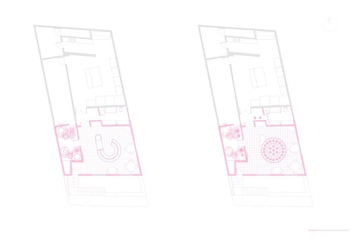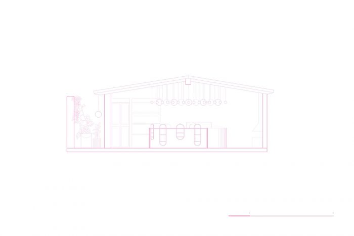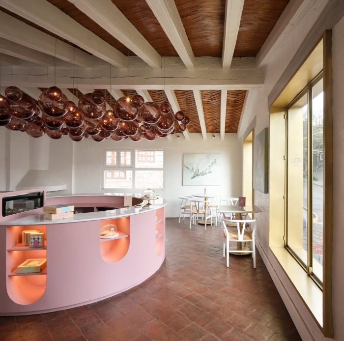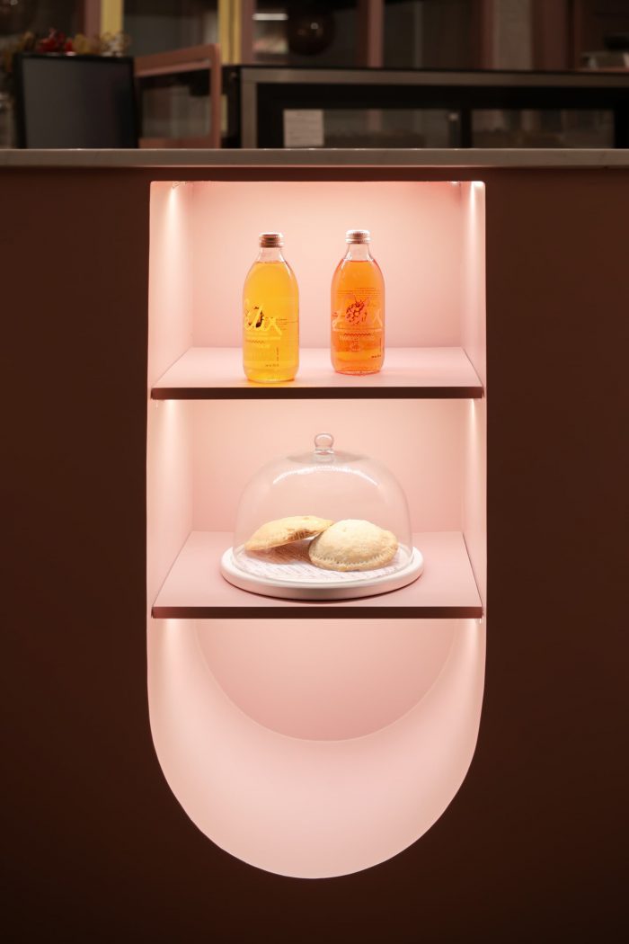 展台是半圆形的,位于空间的中心,这有助于我们摆脱这个地方的正交性,在曼托内拉,你沿着曲线行走,在粉色展台的每个切口发现不同的甜点。在酒吧前面有一个大窗户,它被保留下来,只是颜色被改变了。这扇窗户可以通向一个服务天井,天井被改造成一个带有粉红色花盆的小花园。