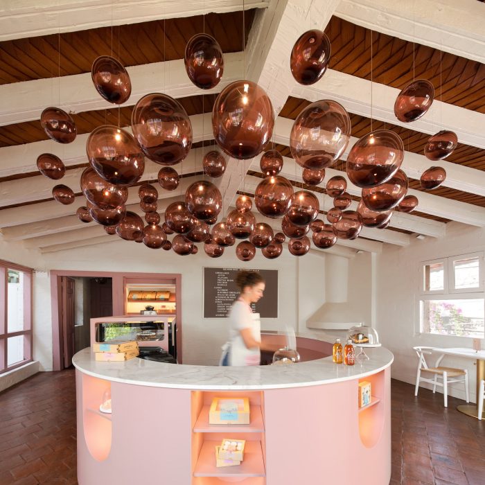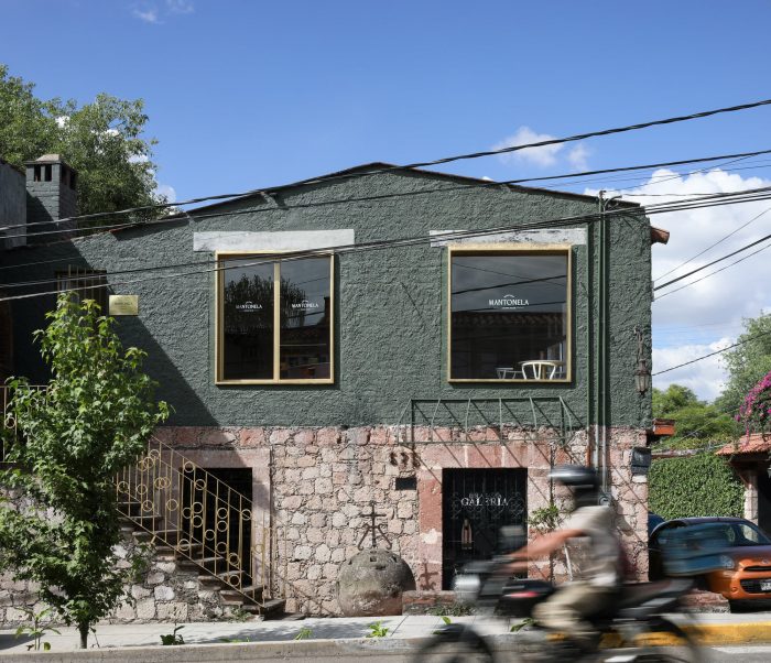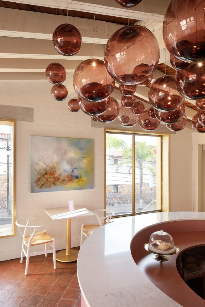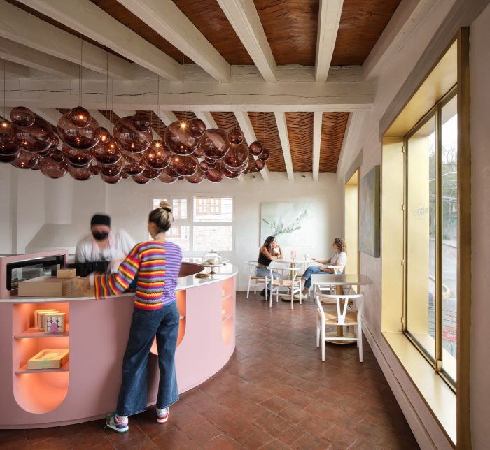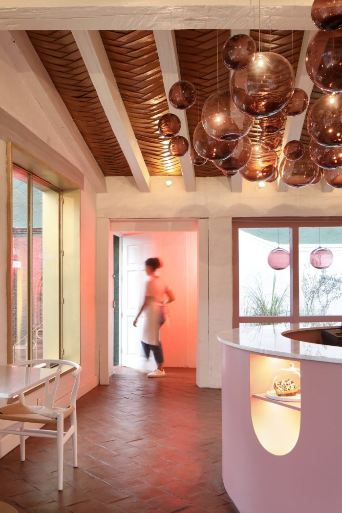 The green façade is a continuity of Santomate, a restaurant with which Mantonela has a great link in the elaboration of its desserts. Mantonela's space was only a production area. So we decided to modify the elements of the facade that conforms Mantonela to invite the user to their new showroom. Changing the color of the existing railing and creating a new pattern, as well as the ironwork of the door and windows to differentiate the showroom from the volume. When entering Mantonela, the color palette changes drastically, the wooden beams previously painted in dark colors were painted white as well as the brick wall. We wanted to preserve materials that we consider valuable, such as the tejamanil and the tile flooring, important materials that maintain the essence of the site's past. The client asked us to implement crystal chandeliers, we propose to recreate them with Mexican handcrafted elements, so this great chandelier that dresses the sky of the exhibition bar, made of pink blown glass spheres handmade in Jalisco, was born.