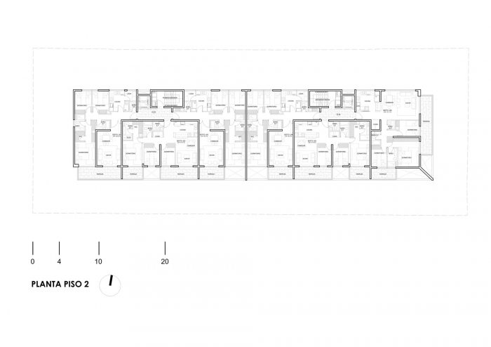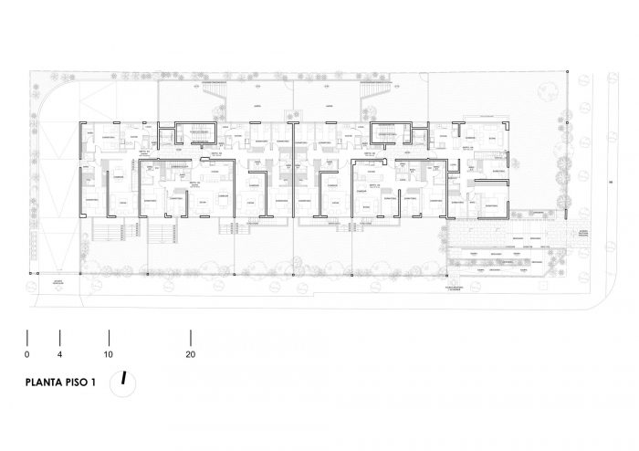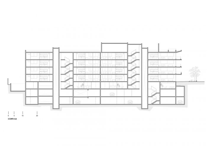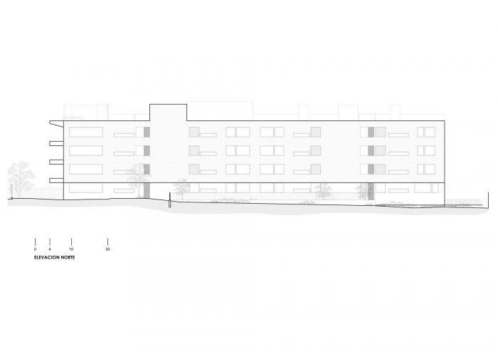 该项目是一个由裸露的混凝土制成的规则、细长的结构。所有的公寓都向街道望去,悬空的露台也是由裸露的混凝土制成。入口被放置在一个角落里,通过一个庭院进入,庭院完全向公共空间开放,有楼梯和残疾人坡道。这实现了街道层和低半层的建筑入口之间的流畅流动。