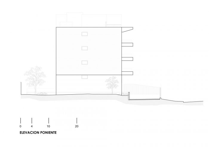 The project is a regular, elongated structure made of exposed concrete. All of the apartments look out onto the street with overhanging terraces also made of exposed concrete. The entrance was placed on a corner and is accessed through a courtyard that is completely open to the public space with stairs and a ramp for the disabled. This achieves a fluid flow between the street level and the building entrance, which is a half-story lower.