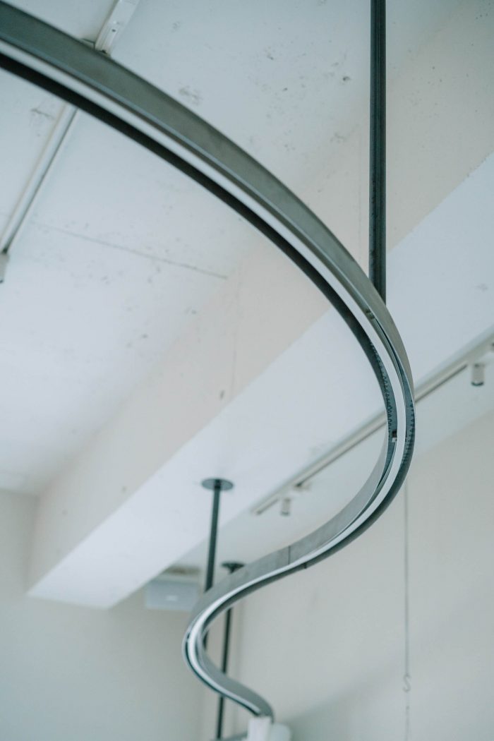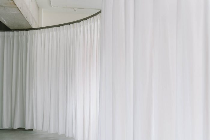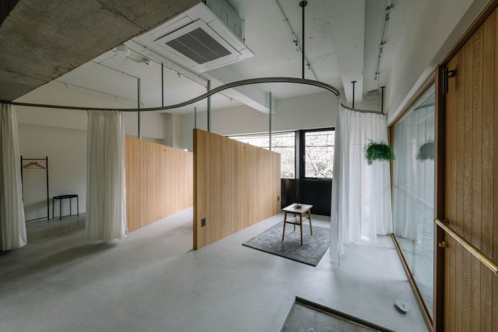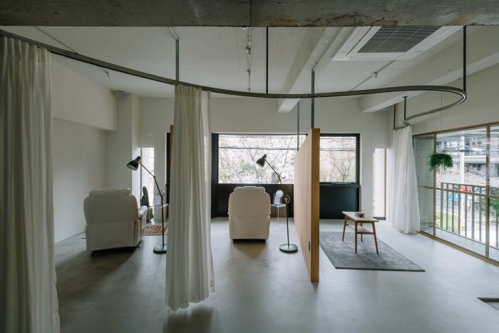 This space is composed of curved lines and is divided by curtains. When the curtain is closed, the space has privacy, and when it is open, it has publicity. The draping of the curtains creates a gradation between open and closed. By freely changing the size of the space, we can achieve a sense of unity with the park, and the interior becomes more public.