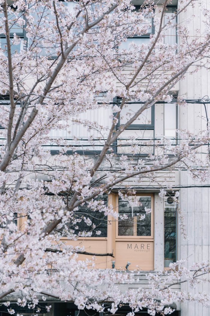 This project is for an eyelash salon called MARE eye design. It is located on the second floor of a building facing a park in the center of Kyoto City. A park is a place of relaxation for many people, and beautiful cherry blossoms bloom every year.