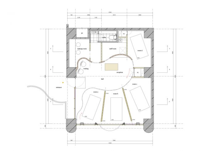 所需的功能包括一个接待区,四个治疗室,一个供手术后使用的化妆室,以及其他设施(厕所和办公室)。这些功能在规划的建筑中被自由安排,同时确保对公园的可见性,并创造了另一个空间,将这些功能一气呵成地连接起来。
