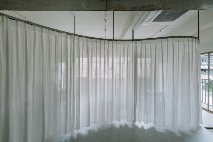 这个空间由弧形线条组成,由窗帘分割。当窗帘关闭时,空间具有私密性,而当它打开时,它具有宣传性。窗帘的垂下在开放和关闭之间创造了一个渐变。通过自由改变空间的大小,我们可以实现与公园的统一感,室内变得更加公开。