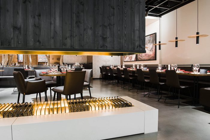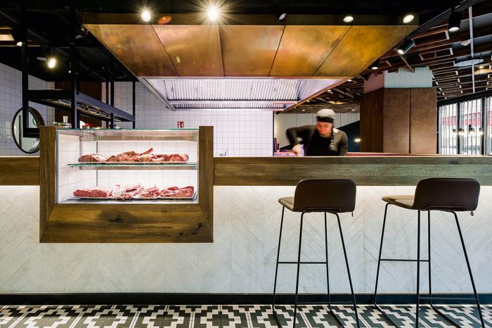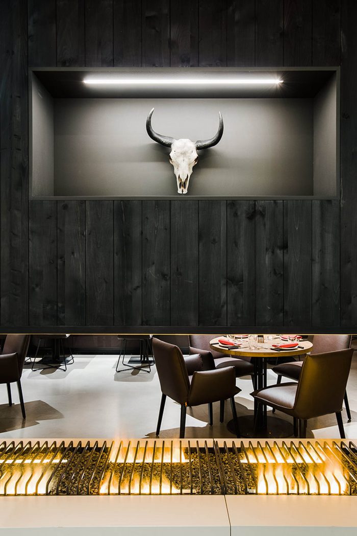 Immediately adjacent to the entrance is a barbecue area with an open fire, which lets guests dive straight into an archaic ambience while whetting the appetite for grilled meat. The counter that is illuminated from beneath and a brass-clad hood give the generous barbecue area a qualitative and earthy feel, as well as functioning as the spatial translation of the Maredo quality promise concerning steak and its preparation. Opposite this area is a salad bar with a fresh and light appearance, which enters into a dialogue of opposites with the archaic nature of the charcoal fire. A long, open fire runs through the seating area furthest removed from the barbecue area at the very rear of the dining room, thereby guaranteeing a cosy, fireside atmosphere throughout the space. A balanced range of seating options – from a long, floating, marble table that can seat a good dozen people to more enclosed leather-upholstered berths in the rear areas of the restaurant – offers a variety of dining qualities, thus catering to guests’ differing gastronomic desires.