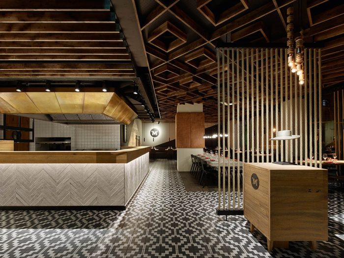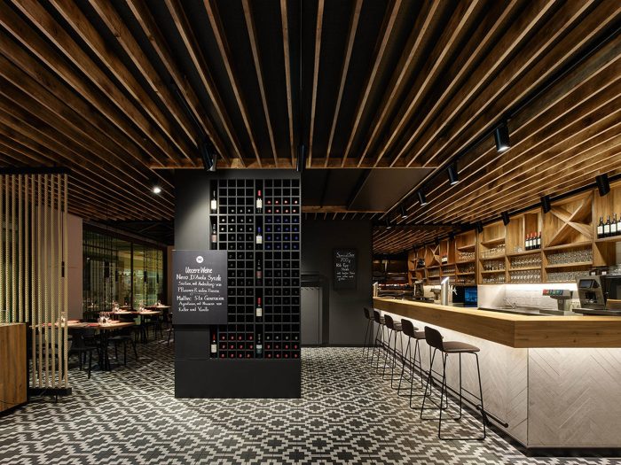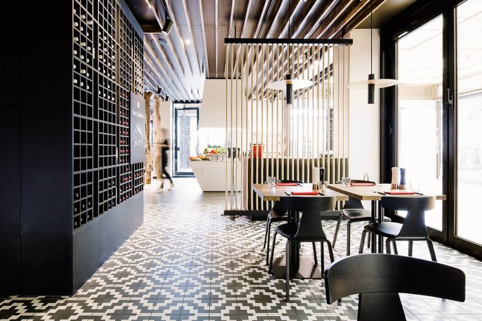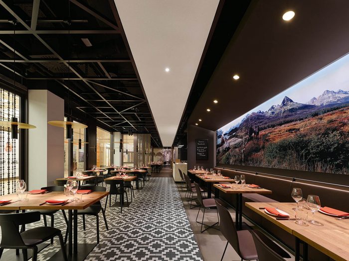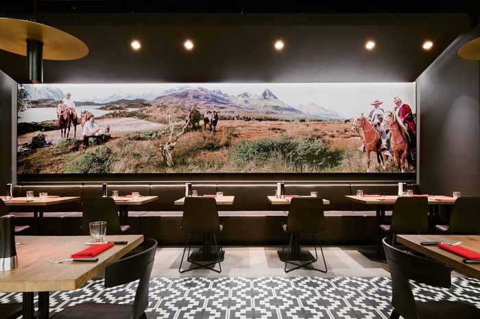 The restaurant chain is all about top quality. An important part of this promise is offering exceptionally high-quality meat, which Maredo sources straight from South America. We have put together a new interior concept that focuses on this key product and its origins, transforming quality into something much more tangible. The new materials and colour world is inspired by the raw material meat with its archaic connotations and intrinsic connection to fire. Its origins are condensed into the figure of the gaucho: the archetypal South American herdsmen. The essence of this is freedom, independence, a closeness to nature and a life lived on endless plains. The traditional gaucho poncho with its woven geometric pattern inspires the spatial elements that are formed from diamond and zigzag shapes and give the Corporate Architecture its high recognition value. It can be found in the floor tiles that were specially designed for Maredo, in the wallpaper on the walls, in the structure of the counter fronts and in the open, coffered wood ceiling. The materials world is characterised by living, natural surfaces such as wood and leather. Tree trunks and ropes, deployed as filter elements to zone the large space, and the traditional cast-iron barbecue grill are all references to the daily life and environment of the herdsman. Large-format photographs on the walls and bull horn and sombrero-shaped lights continue the spatial concept into the smallest detail.