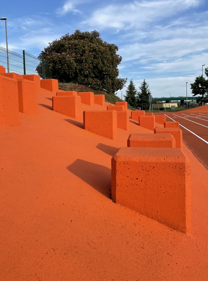 通过放置圆形的元素,以及用于休息和社交的内容,所有三个元素(路径、场地和堤坝)都被连接起来。在圆形元素中,形成了体育看台、社交用长椅和运动员休息的元素。因此,除了连接操场和环境的 "橙色圆圈 "和代表穿过堤坝进入操场的新入口外,这些圆圈还成为向操场和所有体育设施开放的地方。通过这种方式,操场开放并与城市相连,成为市民、运动员和儿童的社交和聚会场所。
