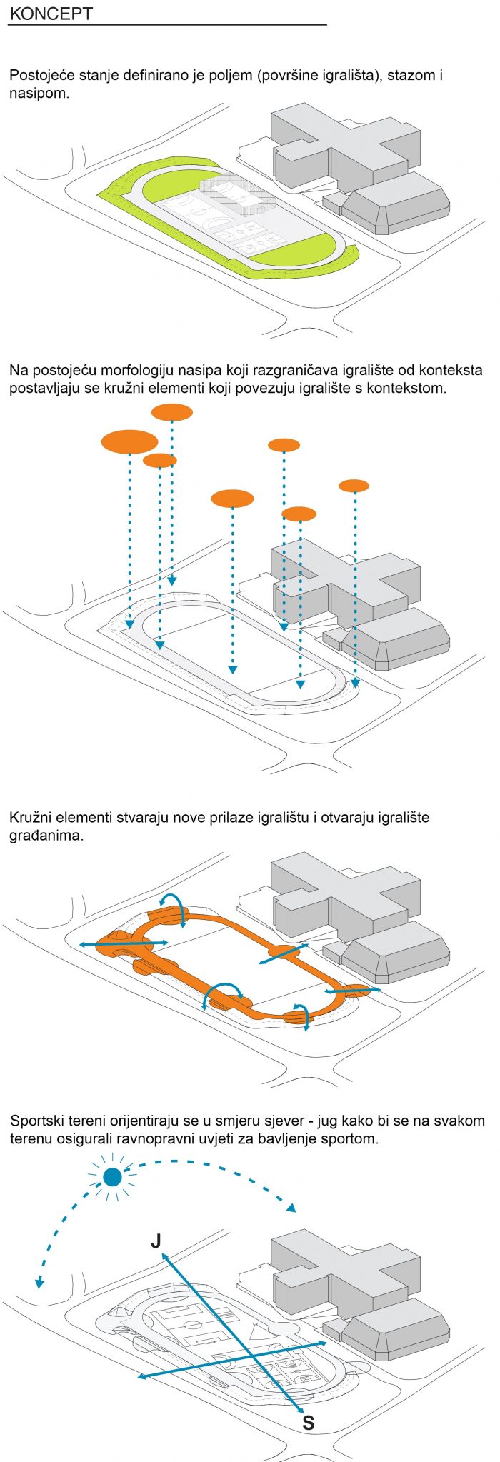 By placing circular elements, with contents for rest and socializing, all three elements (path, field and embankment) are connected. In the circular elements, sports stands, benches for socializing and elements for athletes' rest are formed. So, in addition to the "orange circles" connecting the playground with the context and representing new entrances to the playground across the embankment, the circles also become places which open views towards the playground and all sports facilities. In this way, the playground opens and connects with the city and becomes a place for socializing and gathering of citizens, athletes and children.