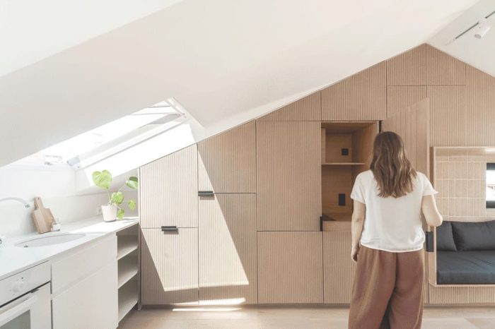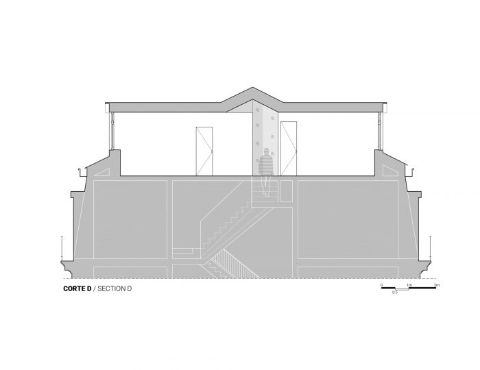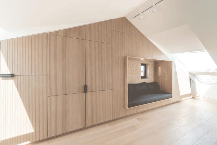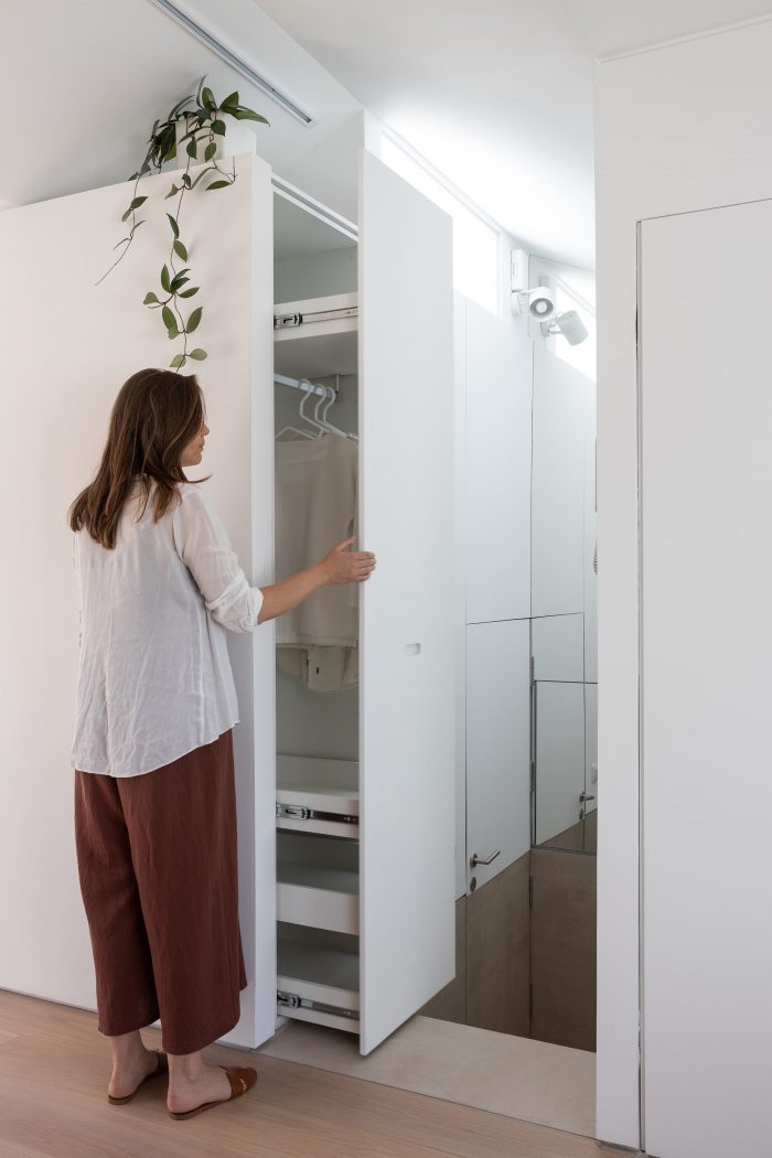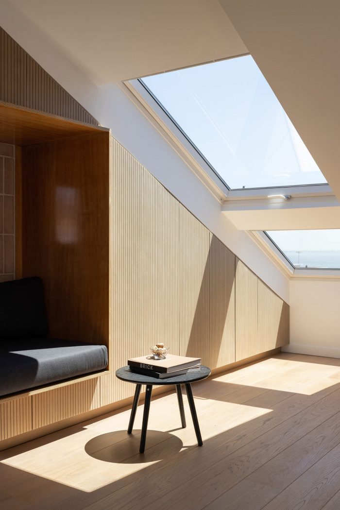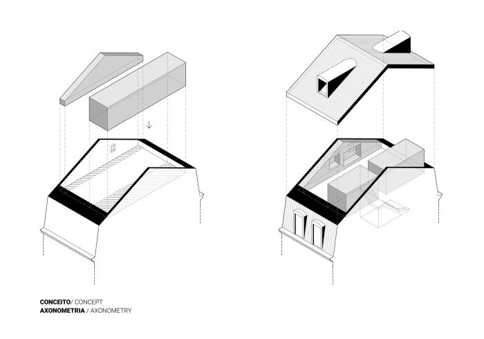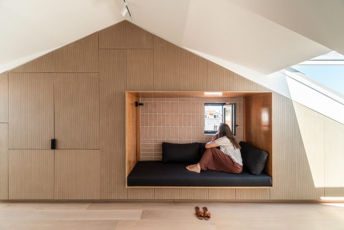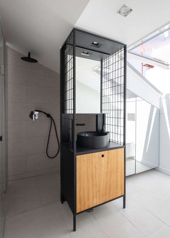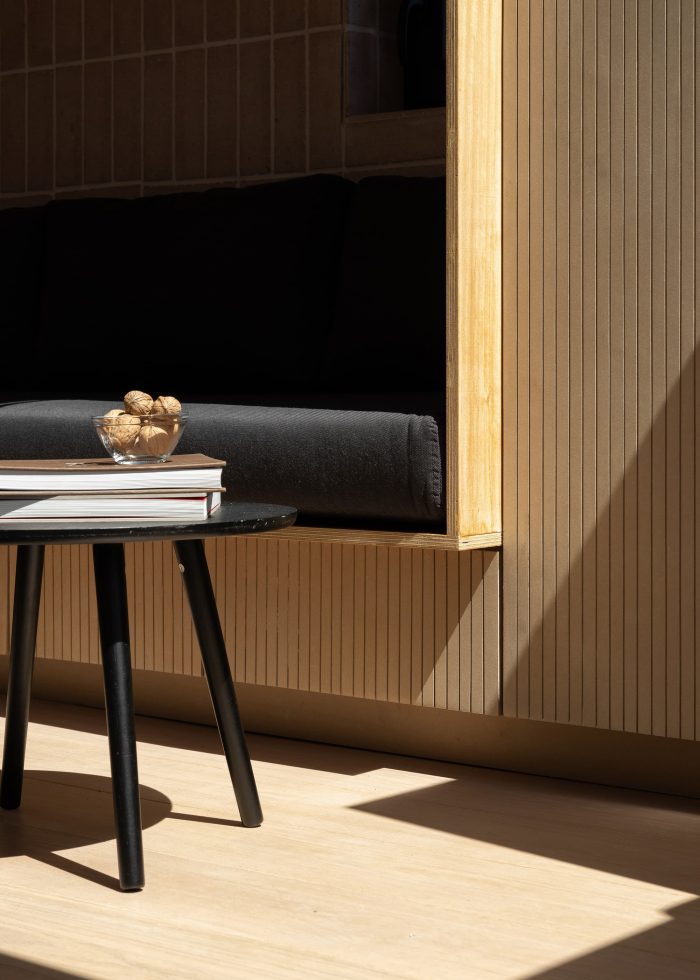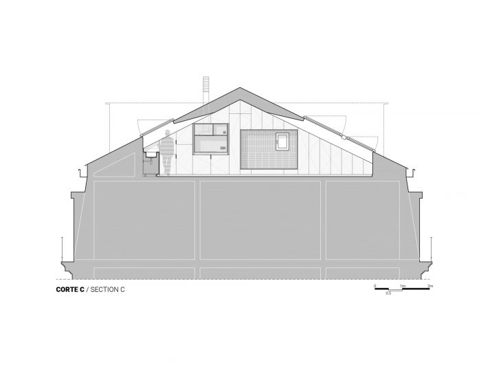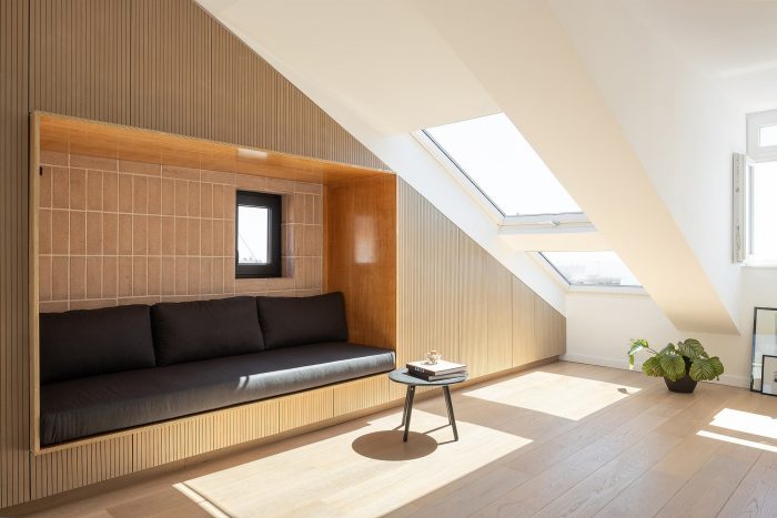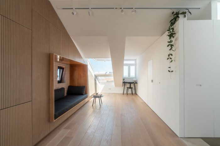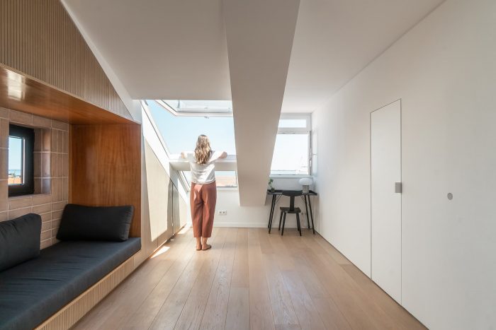 The main objective of this project was to create a space as open and bright as possible. To achieve this goal, we decided to contain the private areas – bedroom, and bathroom – in a separate volume, disconnected from the roof, leaving the remaining open space as a living room. Both storage and kitchenette were contained in another volume created along the living room, an element integrated into the gable wall. This way we were able to free up as much space as possible and introduce additional thermal insulation to the space. By subtracting from this volume, we created two niches: one that serves as the kitchenette countertop area and the other that serves as a sofa from which one is able to admire all the beauty of the carefully studied geometry of the interior.