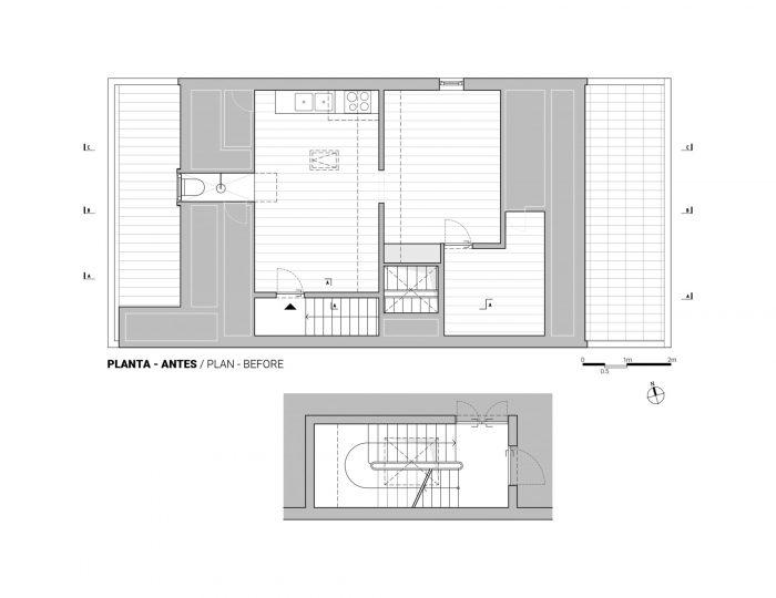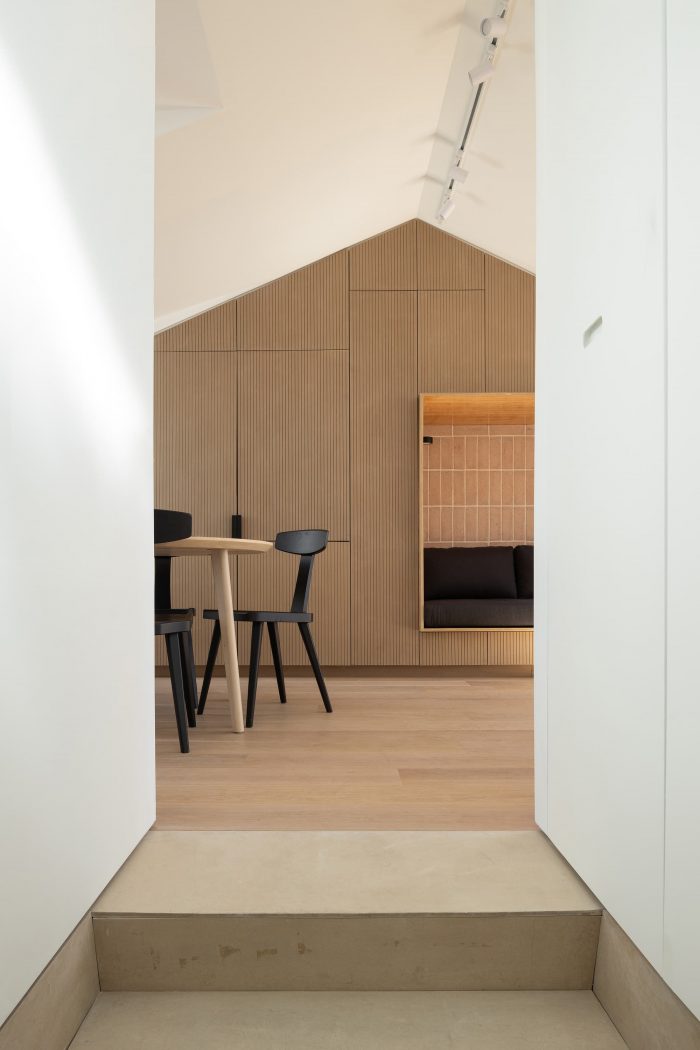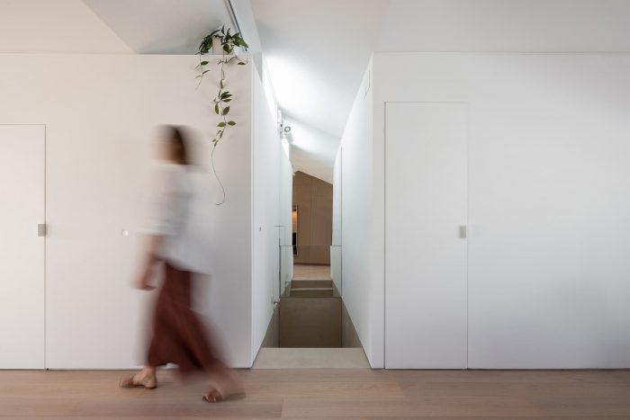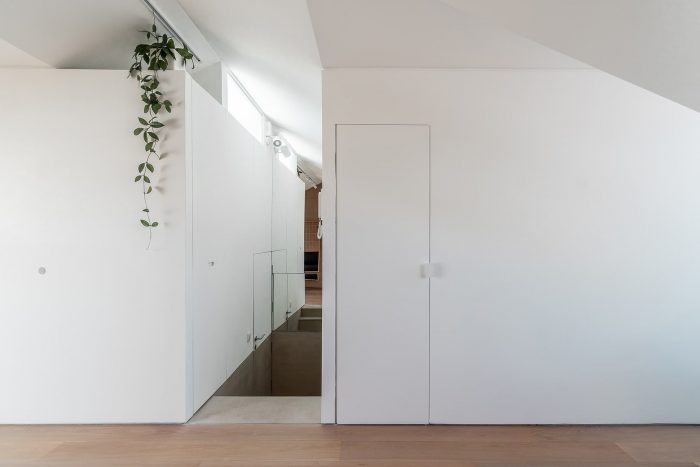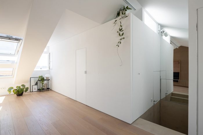Due to the dysfunctionality of the previous configuration of the apartment and the very poor condition of its structure, it became necessary to replace the entire roof and remake all of its interiors. Through a deep intervention into the space of the apartment and the geometry of the stairs, it became possible to introduce a functional bathroom and a more comfortable entrance.