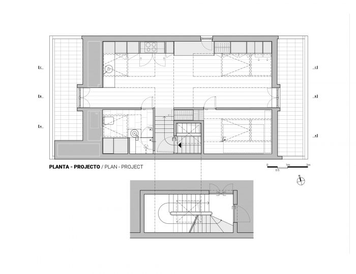 由于该公寓以前的配置不正常,而且其结构状况很差,因此有必要更换整个屋顶并重塑其所有的内部结构。通过对公寓的空间和楼梯的几何形状的深入干预,有可能引入一个功能性的浴室和一个更舒适的入口。