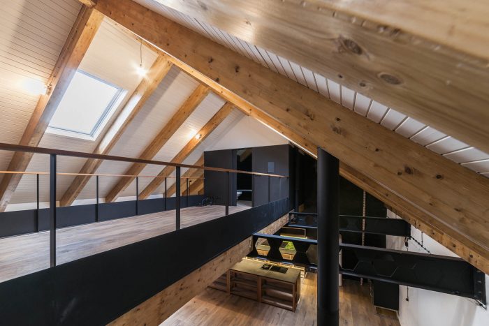 In the reconstruction, the pre-existing roof was reproduced, as was the dividing floor, but they were given a different structure – wooden beams in the roof, which made it possible to entirely free up the space under the roof, and a concrete floor separating the storeys. Making full use of the roof void and removing the dividing walls on the first floor – with the exception of those for some closed-off spaces, namely a bedroom, the laundry area and two bathrooms – provided an ample space where a mezzanine floor was created directly below the ridge of the roof, thus allowing for a comprehensive reading of the space.