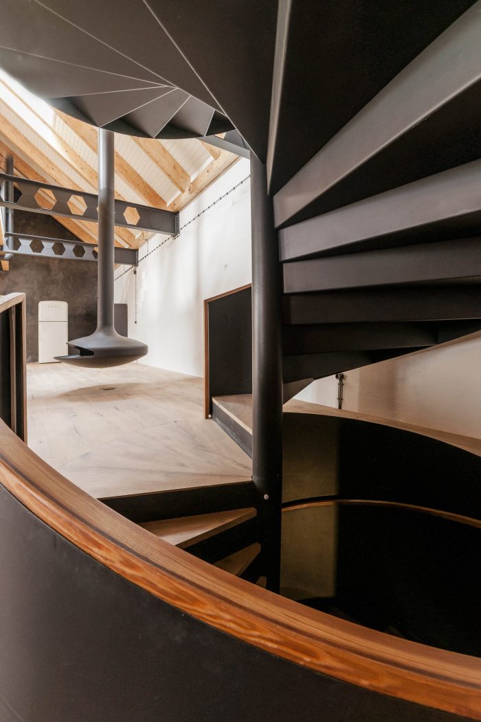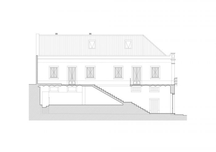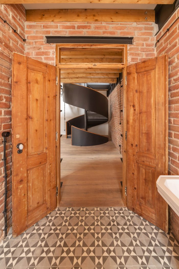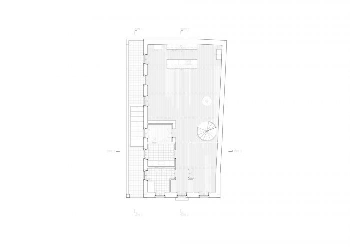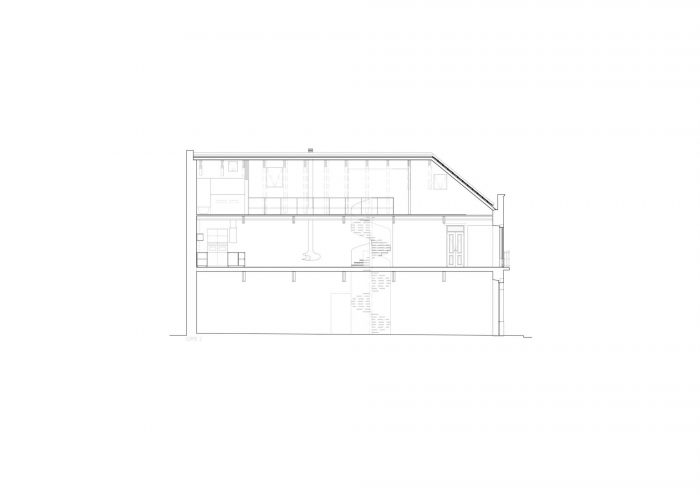 The intervention is in a two-storey building in which the ground floor was a former wine warehouse and the upper floor contained two apartments. The advanced state of dilapidation the existing structure found itself in made complete demolition of the interior and the roof necessary.