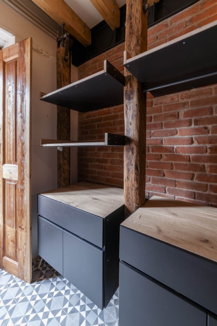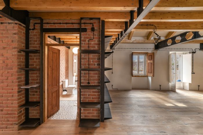 The ground floor was kept spacious – with room for a garage and other occasional uses. The choice of materials ensured continuity with what existed before the intervention (lime mortars, woods, hydraulic tiles), in addition to providing a particular ambience through their materiality (iron, brickwork, wood) which evokes the building’s industrial past.