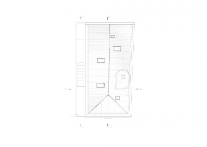 在重建过程中,原有的屋顶和分隔层都被重现,但它们被赋予了不同的结构--屋顶上的木梁,使得屋顶下的空间完全被释放出来,而混凝土地板则分隔了楼层。充分利用屋顶的空隙,拆除一楼的隔墙--除了一些封闭空间的隔墙,即一间卧室、洗衣区和两间浴室,提供了一个宽敞的空间,在屋顶屋脊的正下方建立了一个夹层,从而可以全面阅读空间。