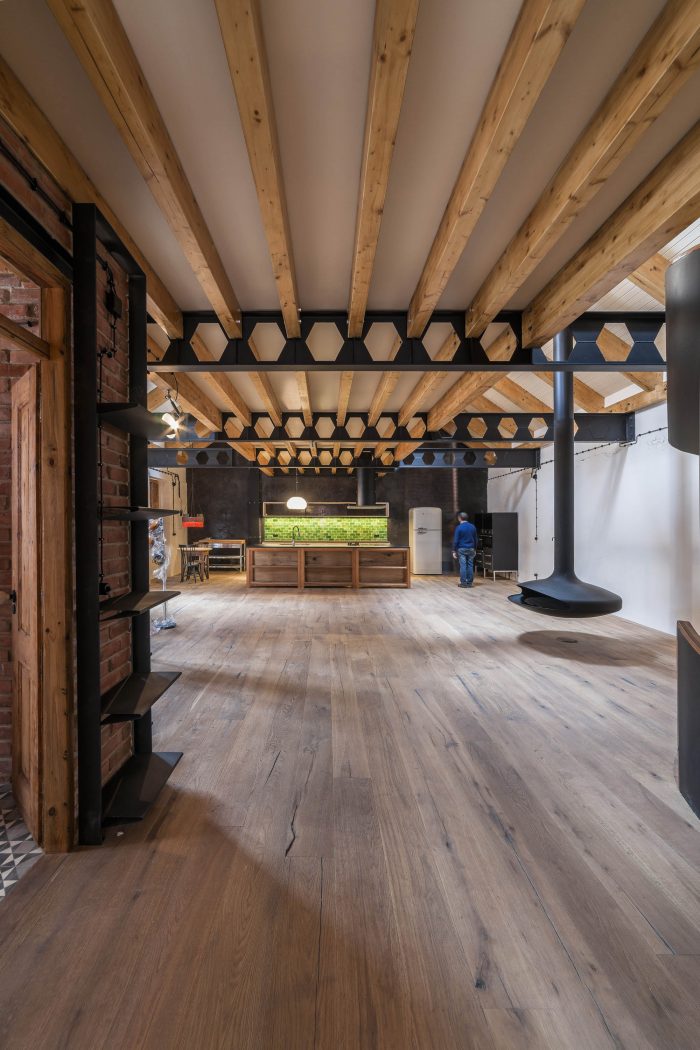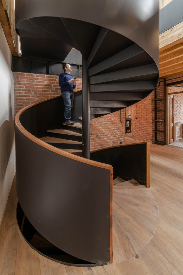 底层保持了宽敞的空间--为车库和其他偶尔的用途提供了空间。材料的选择确保了与干预前存在的东西(石灰砂浆、木材、液压瓦)的连续性,此外还通过其材料性(铁、砖瓦、木材)提供了一种特殊的氛围,唤起了建筑的工业历史。