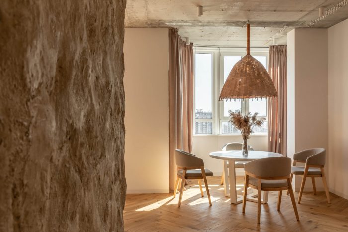 Mazanka is an apartment in a Kyiv skyscraper with a view of the Dnipro river, where ancient construction technologies were used. In the Ukrainian language, мазанка (mazanka) means a small village house built of wood, clay, and reeds. The name comes from the word мазати (mazaty) — to cover something with a layer of clay. Mazanka apartment is a dialogue of our architects with the past. And its result is a step towards the originality of modern Ukrainian design and Ukrainian culture as it is. The client of the project is a young woman who shares our views of a home as a place of strength. She chose our studio to fulfill her long-held dream — eco-housing with natural materials and modern technologies being harmoniously combined, and the design sophisticatedly emphasizing the uniqueness of the space. It was important for us not only to create an interior that will meet these requirements but also become near and dear to the customer.