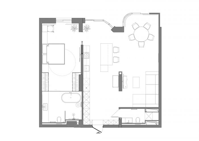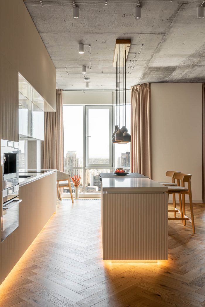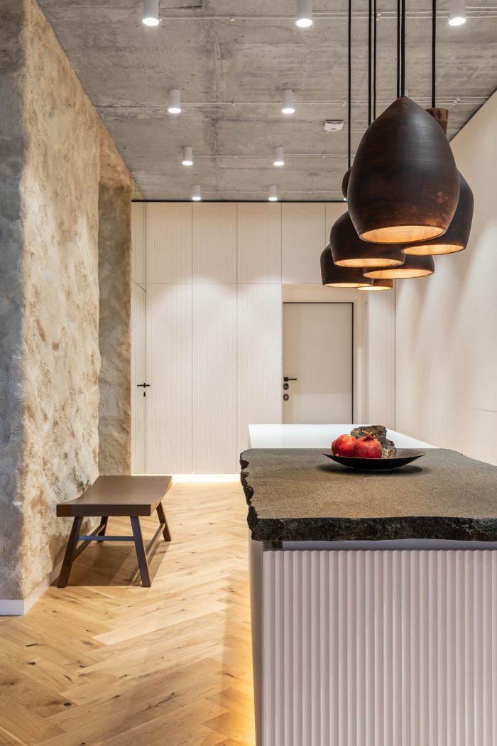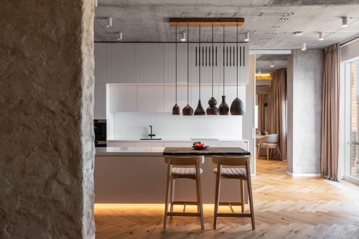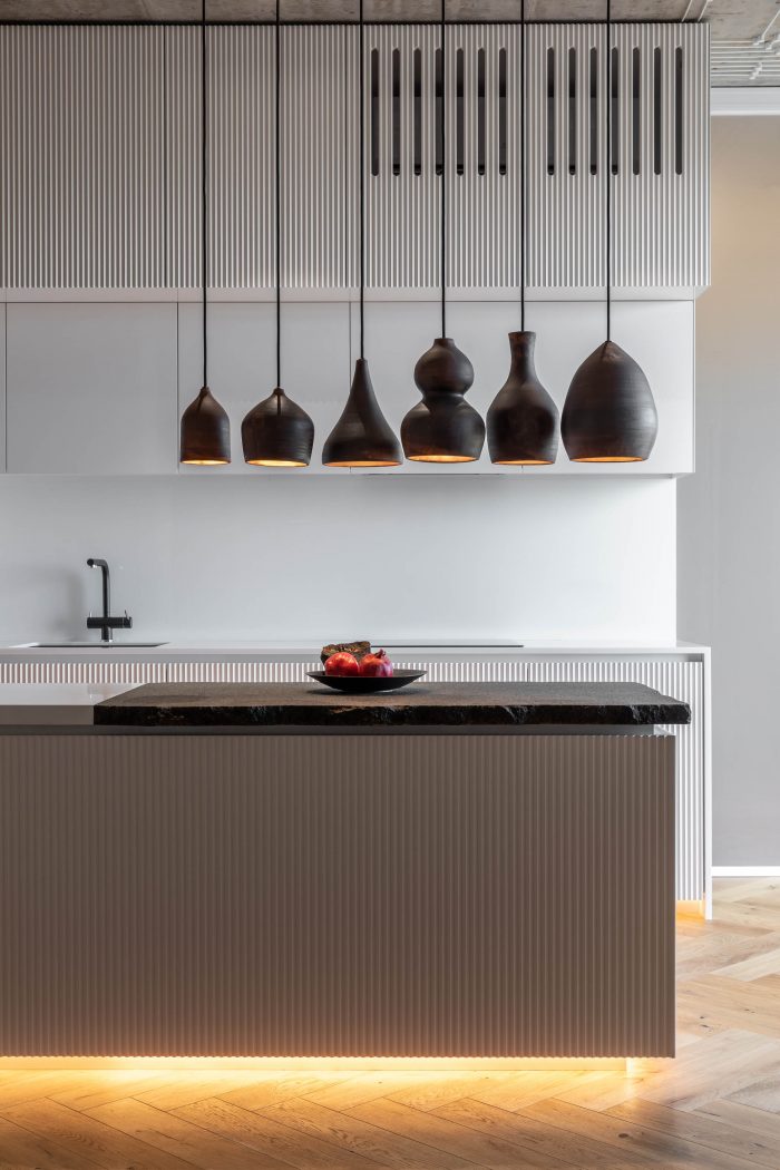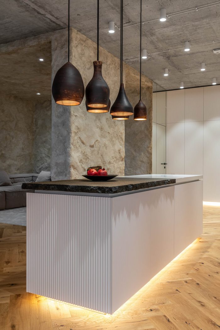 First off, we designed an open but thematically zoned space for the owner's favorite home routine: yoga, dancing, cooking. Therefore we combined the kitchen, living room, and balcony but left a fairly clear thematic division due to different textures and materials. The kitchen is located in the central area of the apartment. Ribbed cabinets make the space rhythmic. The granite tabletop island balances the jug lamps that attract attention with their playful form variation. The lines of the kitchen are airy and soft.
